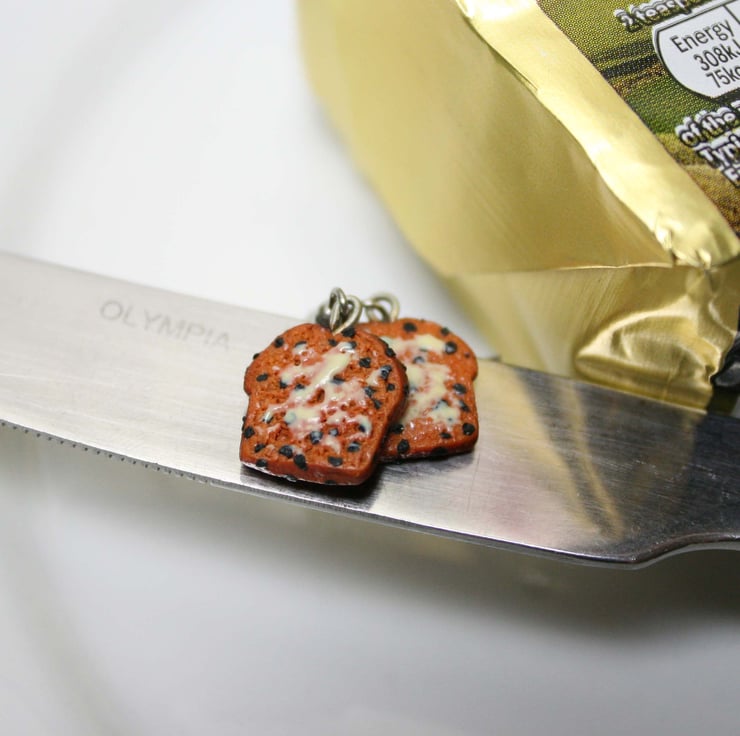 Bara Brith is another traditional welsh bake - a yeast bread enriched with dried fruit, usually raisins and currants that have been soaked in tea. Some like it plain, some with butter (menun) some with honey (mel). Here i have created two scrummy slices with a smear of butter on each, using polymer clay and skilz :)