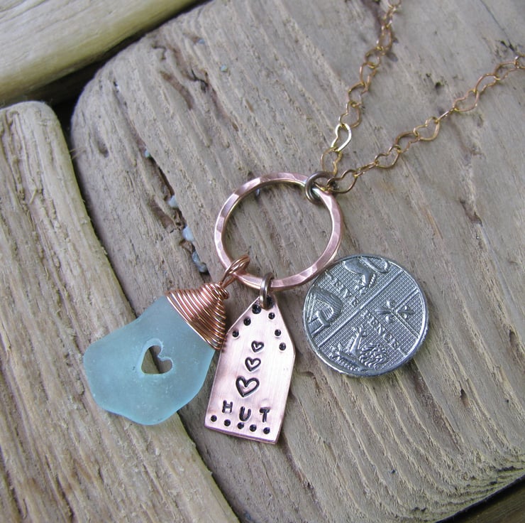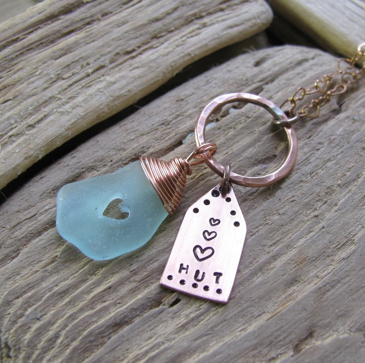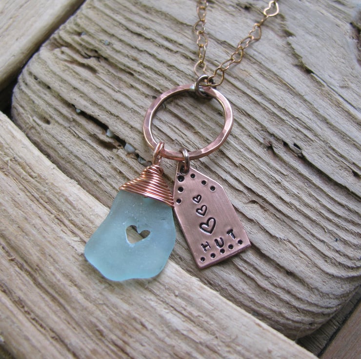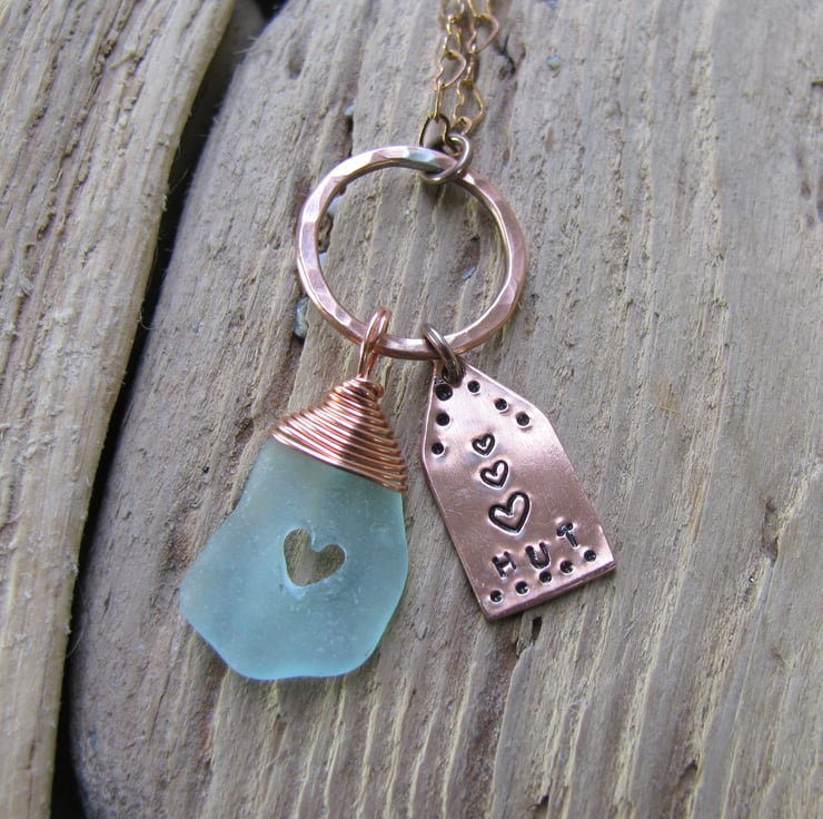 lovely frosted pale blue coloured piece of sea glass with a wire wrapped bail. It has a lovely carved heart within, and a cute handsawn beach hut charm made from copper sheet, these are attached to a handmade soldered copper hoop. The wire is bare copper .Suspended from a bare copper heart-link chain. Approx. 18" (will naturally tarnish/age )