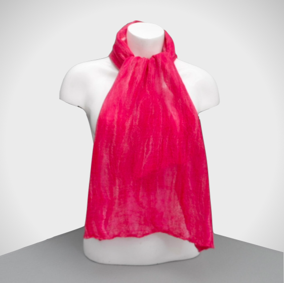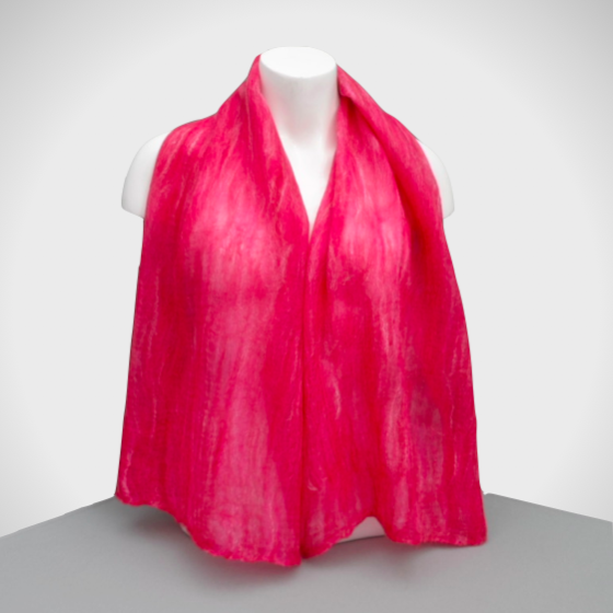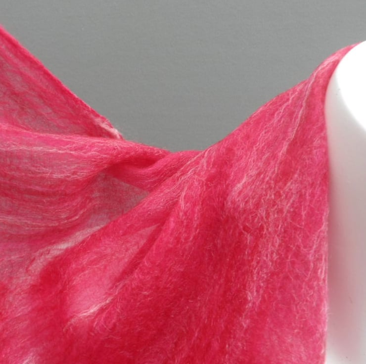 A blend of red and bright pink merino wool and beached tussah silk have been used to make this scarf. Working on a bright pink silk chiffon base fabric, a fine layer of the blended wool has been nuno felted, a process which causes the wool fibres to migrate through the silk and bind with it.