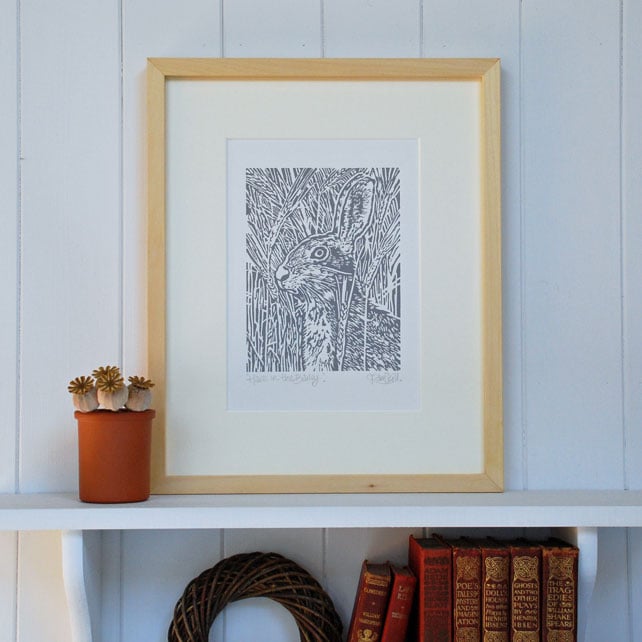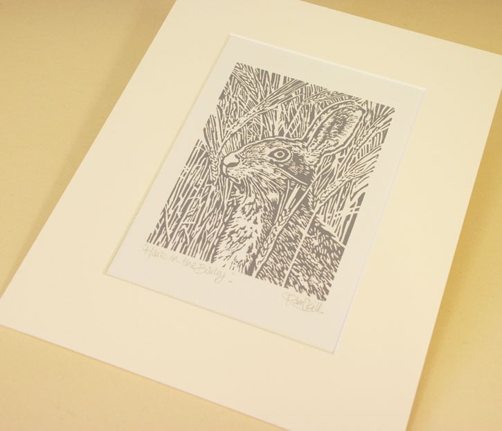 Hare. Grey Hare print - 'Hare in the Barley' - Original, hand pulled Linocut Print, printed on hand press. Supplied in a cream mount so all you need is a frame!