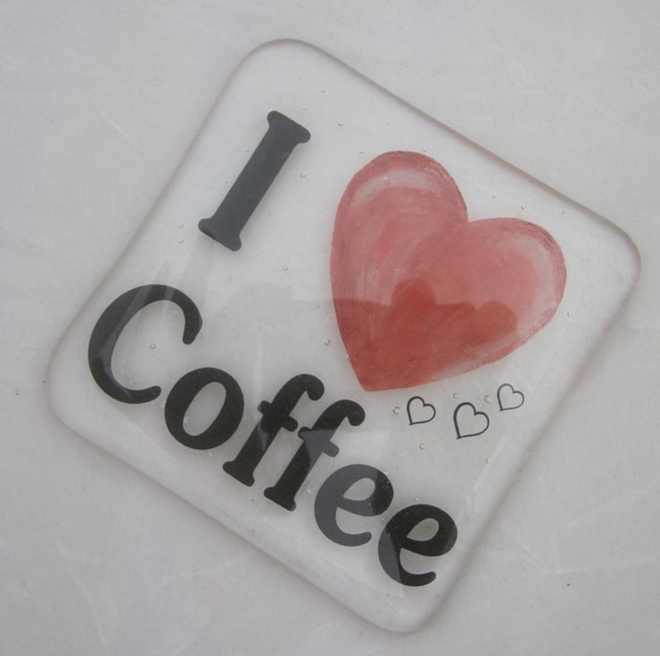 This coaster has an 'I love coffee' design on clear glass. It has been fully annealed to make it strong and is suitable for use with hot tea or coffee cups but not pans straight from the oven. It would make a great gift, secret santa or stocking filler.