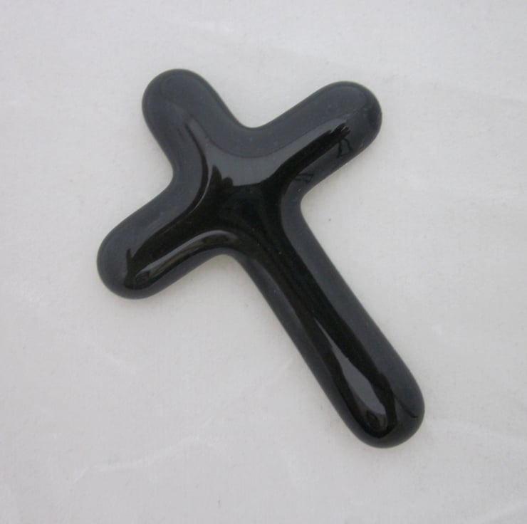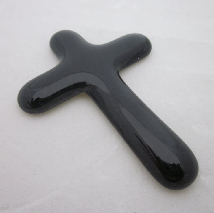 It is a stunning cross, made with blue aventurine which, whilst technically transparent, fuses to a dense dark opaque when fired alone. The result is a beautiful, almost black, glass which is both simple and yet has depth of colour. The aventurine glass has a nature subtle shimmer.
