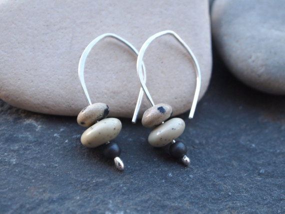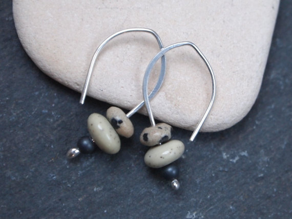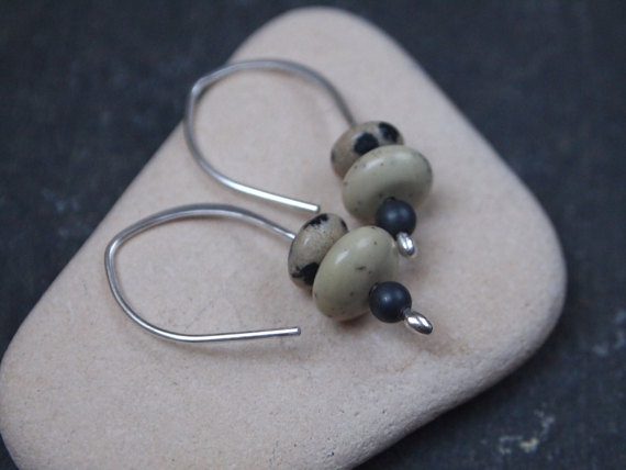 Speckled dalmatian jasper and creamy butter jade roundels have been teamed up with a small matt hematite bead to make these simple drop earrings.