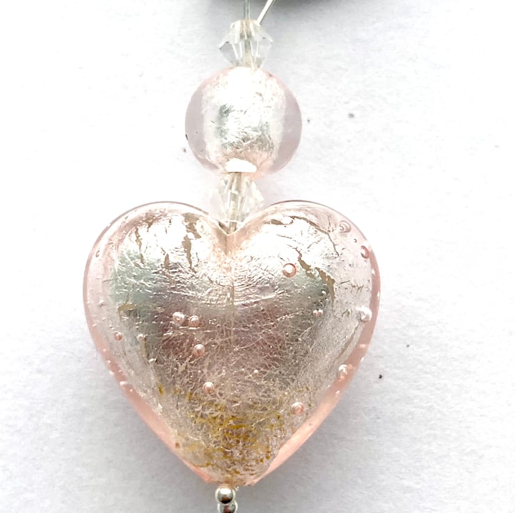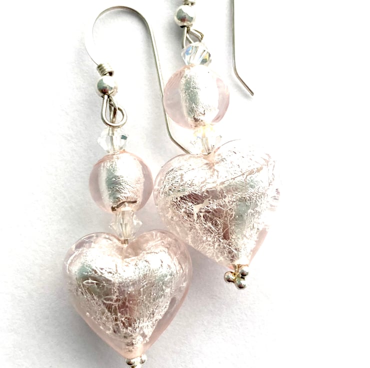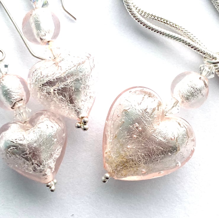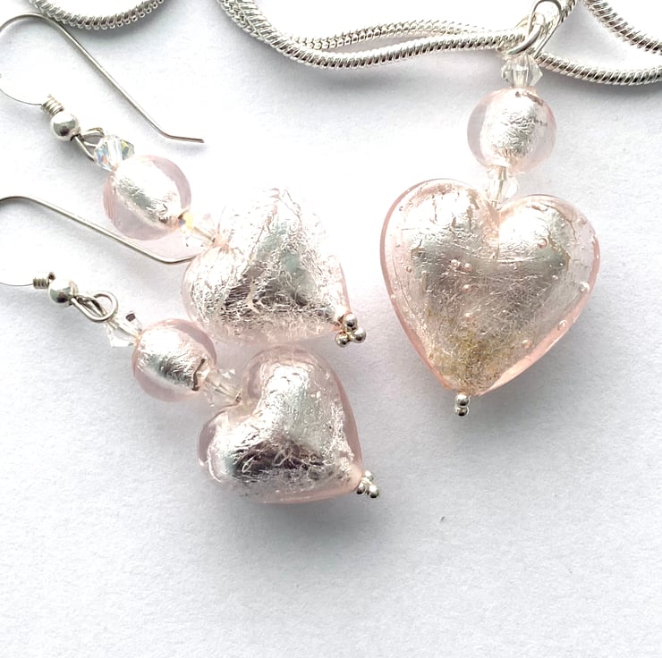 A very pretty Murano glass pendant and earrings set with a pure silver foiled palest pink Murano glass heart bead (20mm) with a matching round bead and a sterling silver round bead.The pendant hangs from a sterling silver chain(18ins.) with silver fastening. The matching earrings have pure silver foiled palest pink Murano glass smaller hearts with matching round beads and sterling silver round beads and hang from sterling silver ear wires. The earrings measure 40mm in length excluding wires. The set is presented in a velvet gift pouch.
