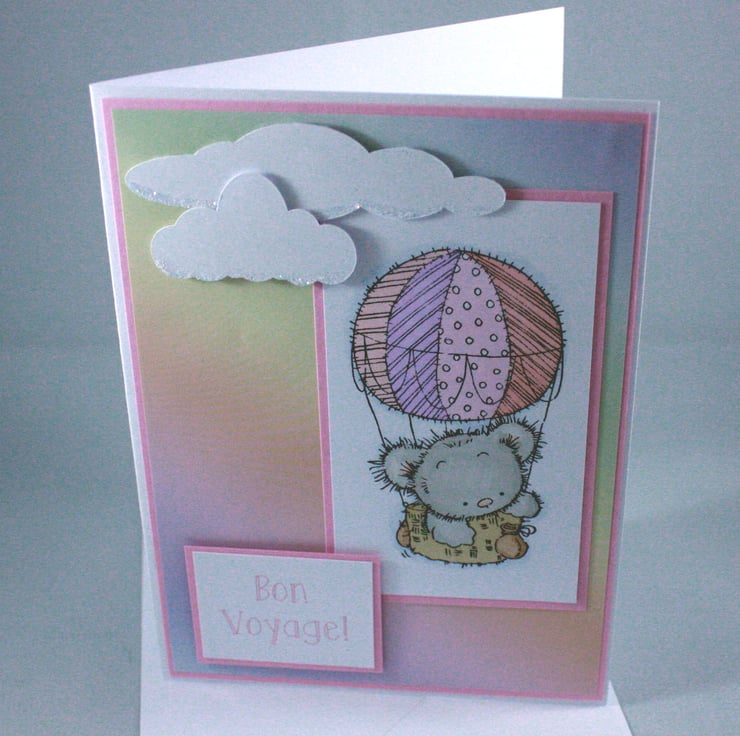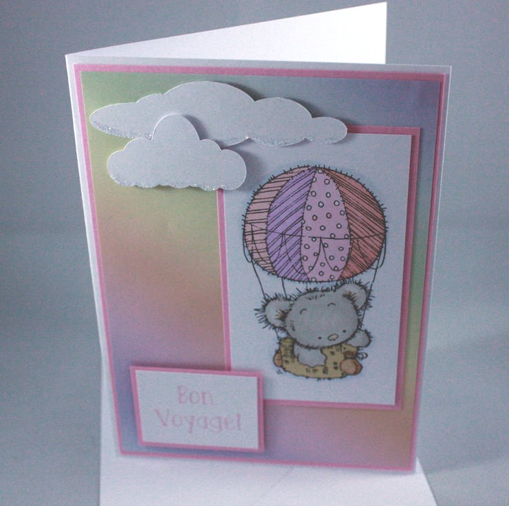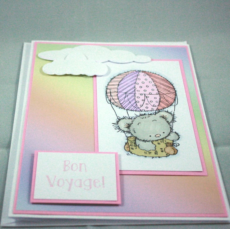 Bon Voyage card, featuring a hand stamped and coloured image of a bear in a hot air balloon, on a rainbow background.