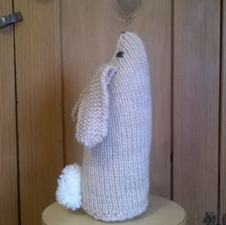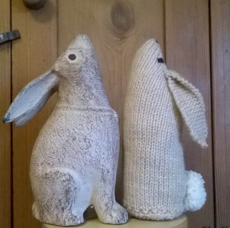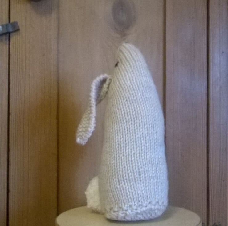 A moon gazing hare, hand knitted in the most scrumptious vanilla fudge coloured yarn, boasting the longest ears ever and the fluffiest cream coloured tail.