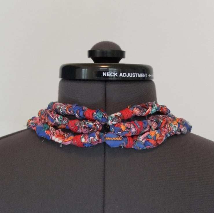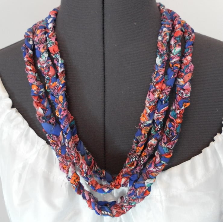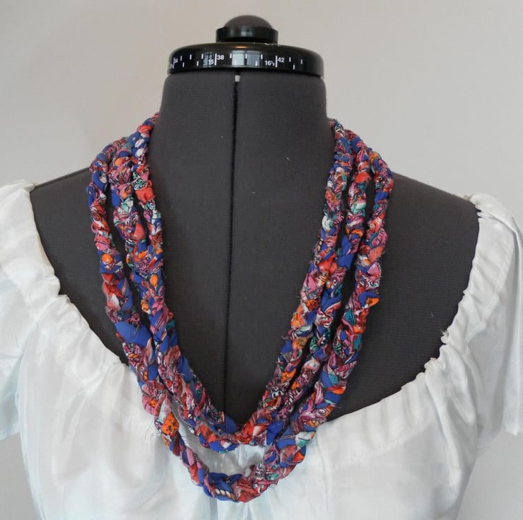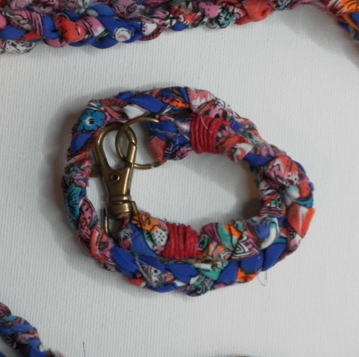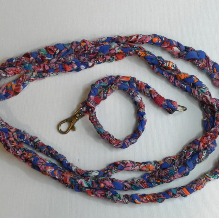 One of a kind, shabby chic, plaited fabric necklace and bracelet. The necklace has three braids which are sewn and whipped onto a brass tone metal ring. It has a drop of approximately 32cm. The bracelet is a single braid designed to go round the wrist twice and is fastened with a brass tone swivel clasp and ring. The bracelet is approximately 35cm long and has a slight stretch.