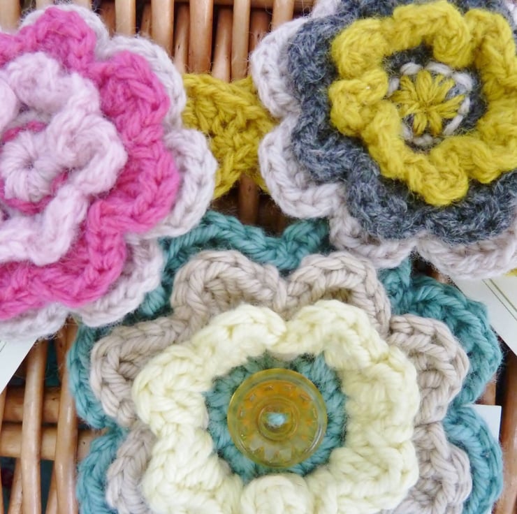 It comprises of three rows of crochet petals, a crochet leaf and a central button.