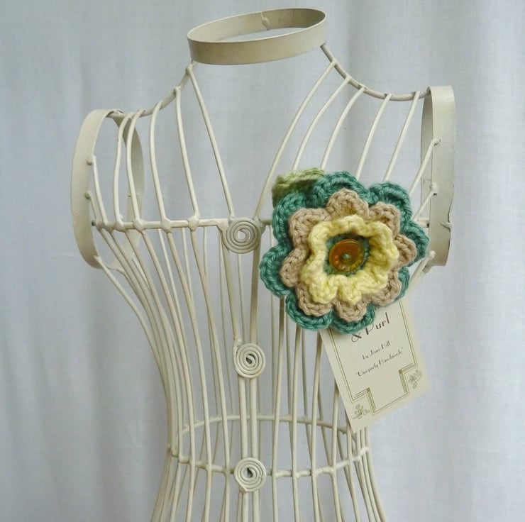 Flower corsage brooch in soft pastel shades. Hand crocheted in cotton yarns with added vintage button.