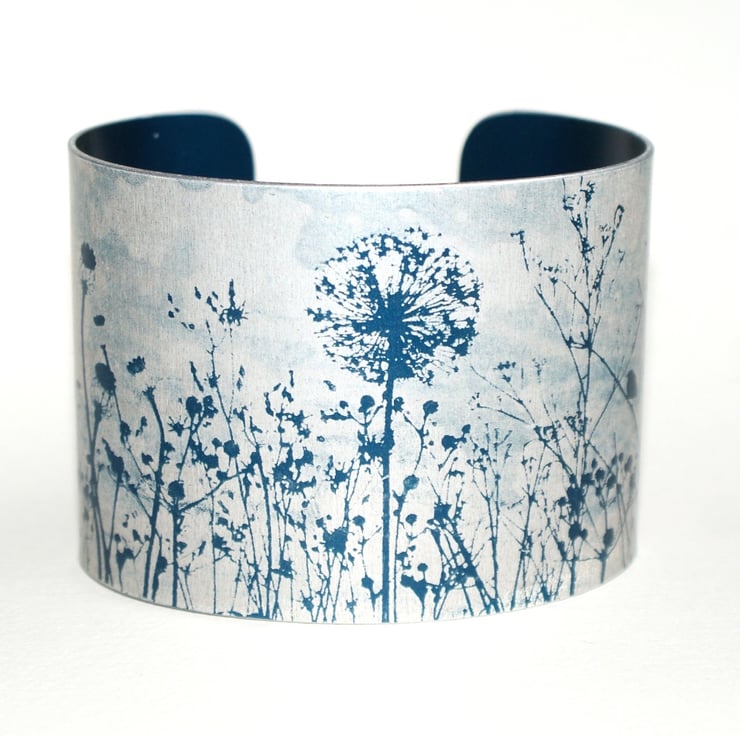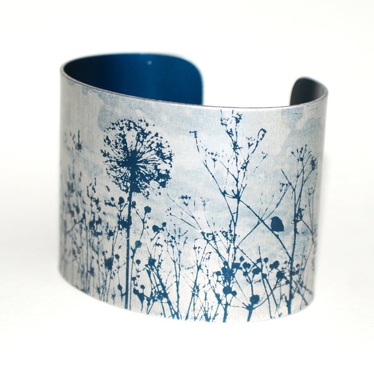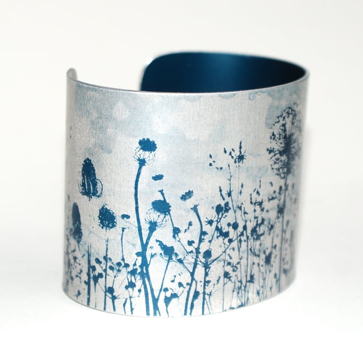 A hand dyed aluminium cuff with a hedgerow along the bottom. The design originates from my own photographs which I layer and edit in Illustrator until I have a black and white image. This is then used as a resist when dyeing the cuff and leaves the design in the silver colour of the metal. Please note your cuff may vary very slightly from the image as the dyeing process isnt exact.