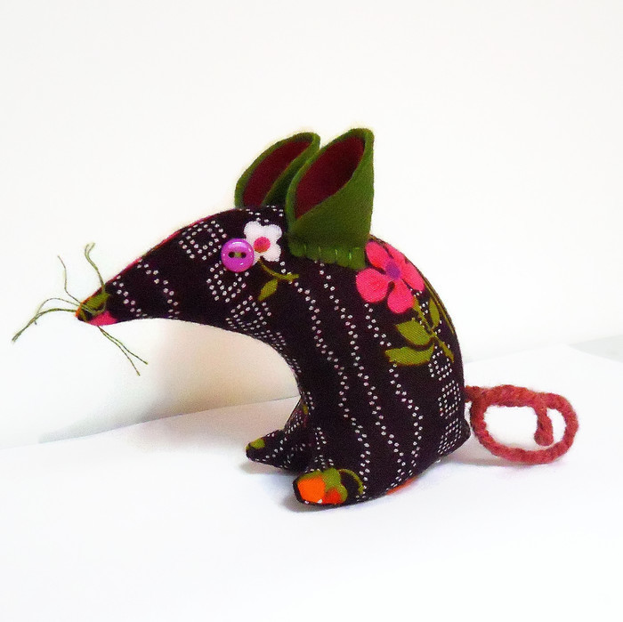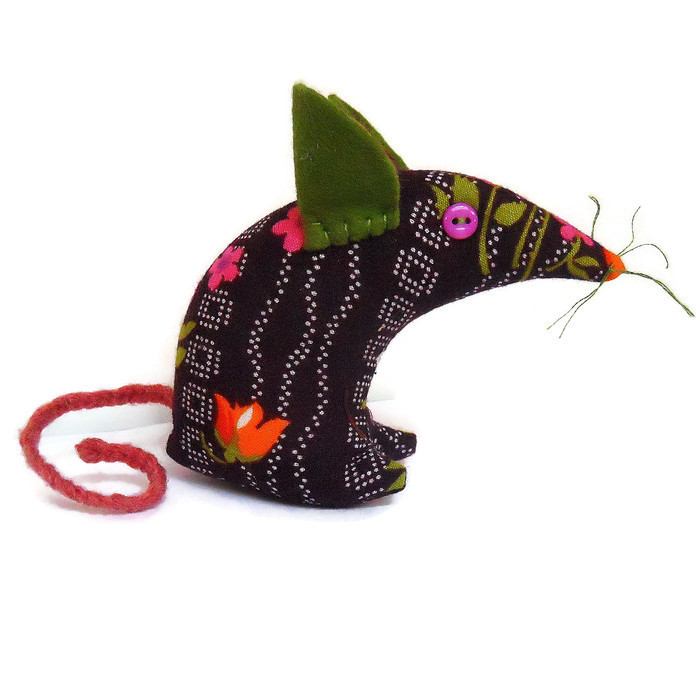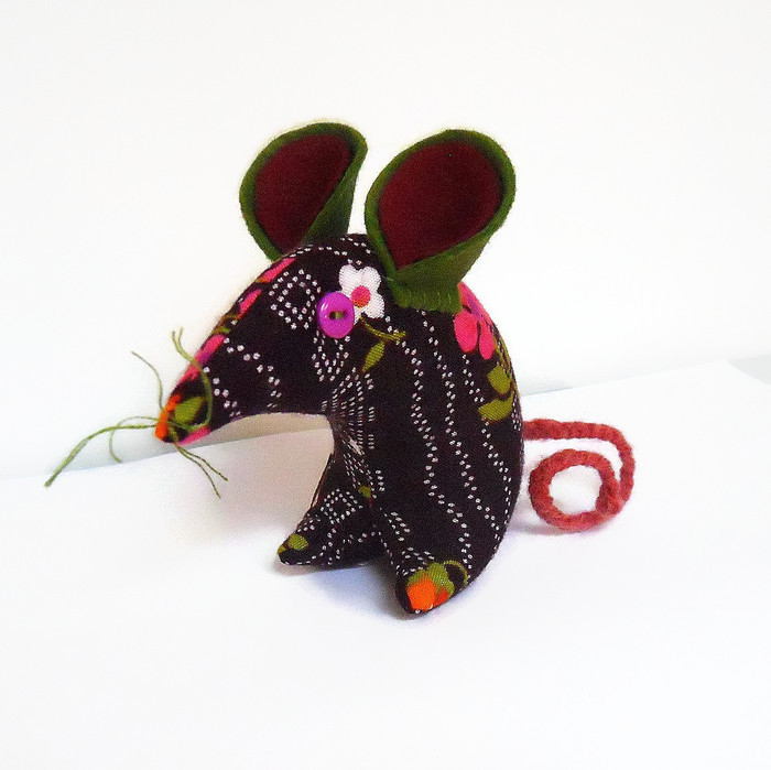 Retro 'tastic Mouse mouse has button eyes, felt ears and a plaited wool tail and cotton whiskers. She is approx 10cm tall from the tips of her toes to the top of her ears and approx 11cm from his nose to his bottom.