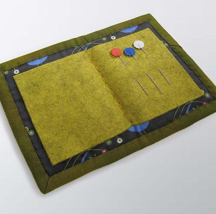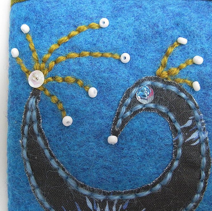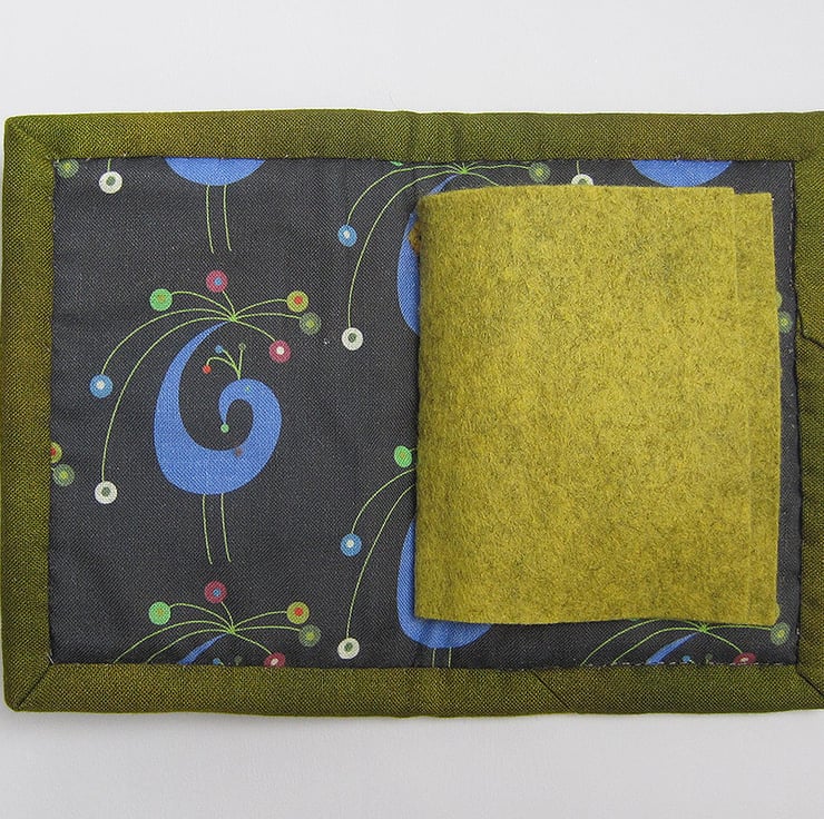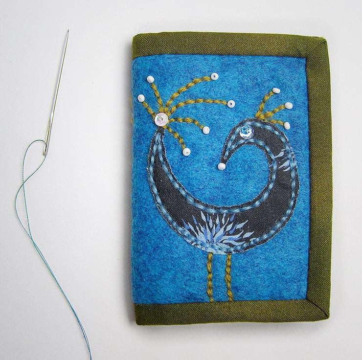 Turquoise blue wool felt needle case with hand appliquéd peacock bird on the front. The inside is lined with my own bird print design in cotton. Inside is a piece of felt to pin your needles or pins onto. The edge is bound with khaki cotton. The product is supplied with a needle and some pins. The size of the product is 8cms by 11cms.