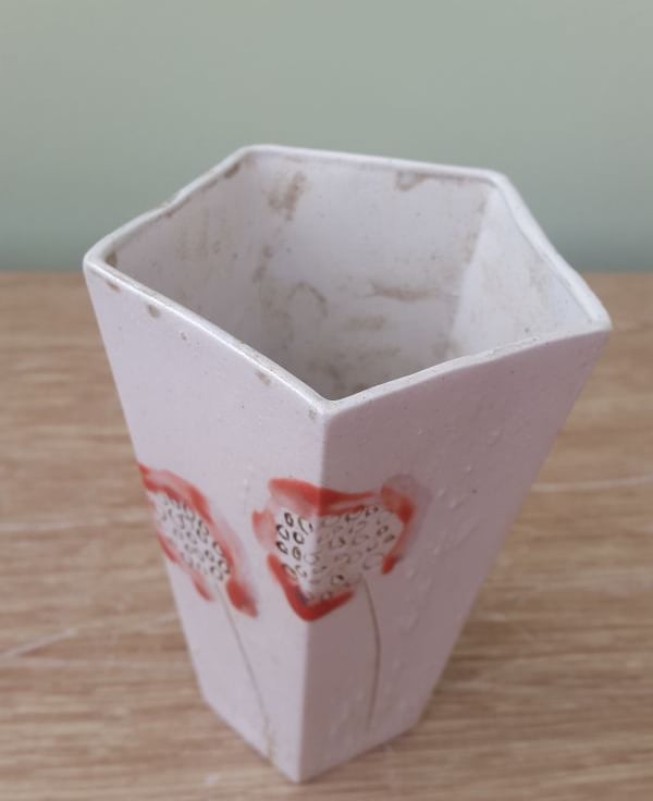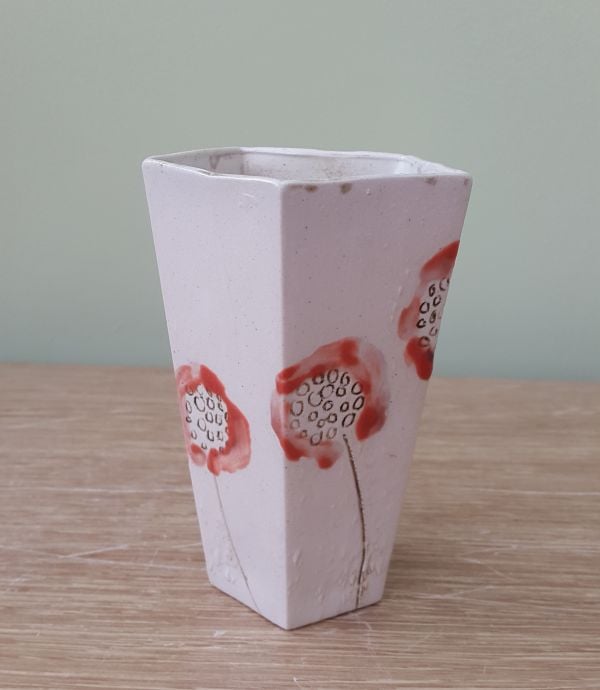 A hand-engraved red flower design features around the exterior of the vase. This vase has been glazed with a smooth finish and can be easily wiped clean using a cloth and warm water.