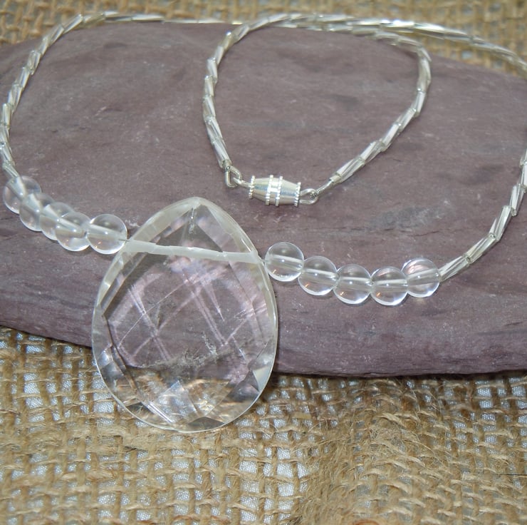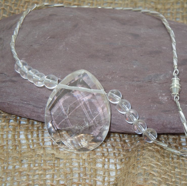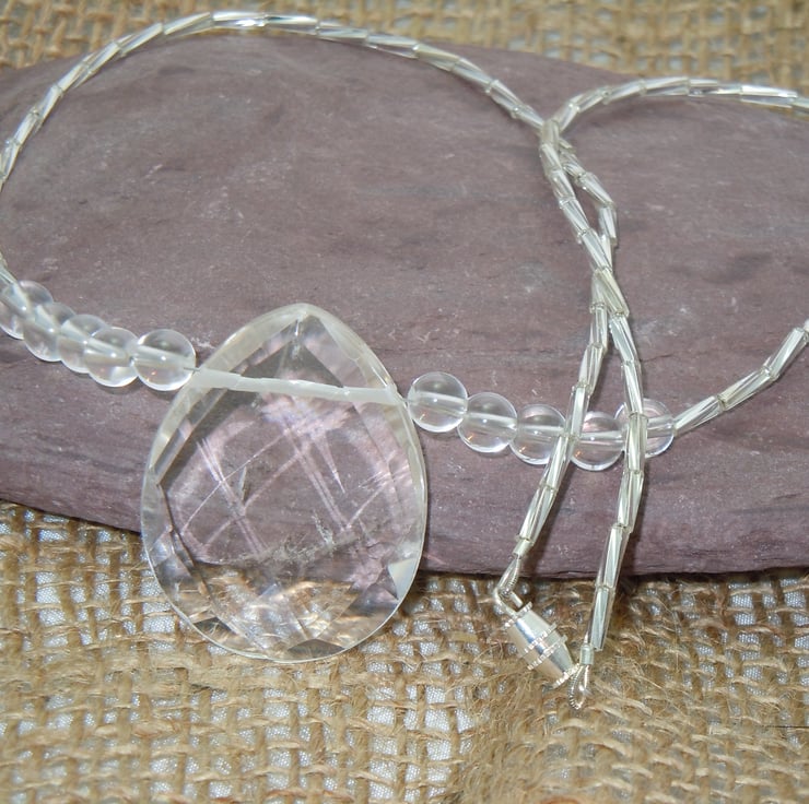 A beautiful faceted clear crystal quartz top drilled pendant necklace with natural inclusions threaded with clear quartz beads & glass bugle beads & finished with a silver plate barrel clasp. Lovely rainbow reflections in this faceted oval quartz pendant. Clear Quartz is a birthstone for April.