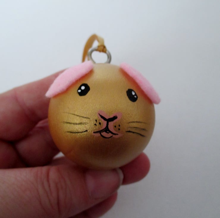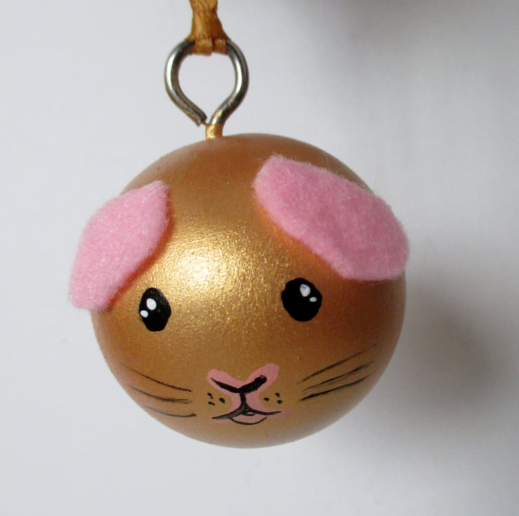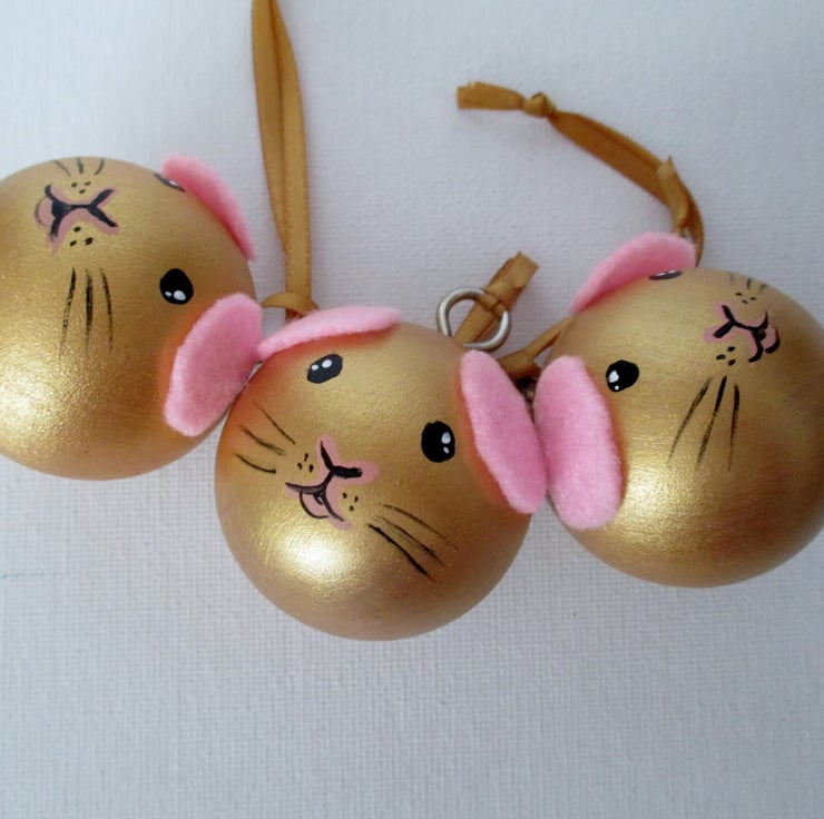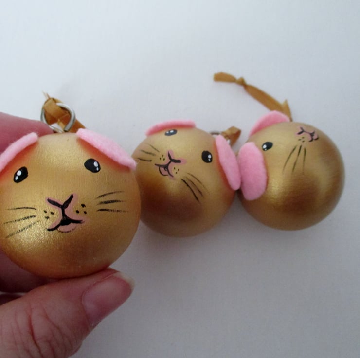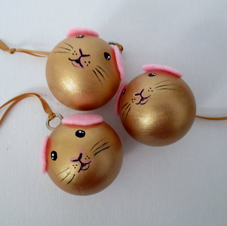 A set of three hand painted wooden Christmas tree bauble decorations in the form of golden guinea pigs.