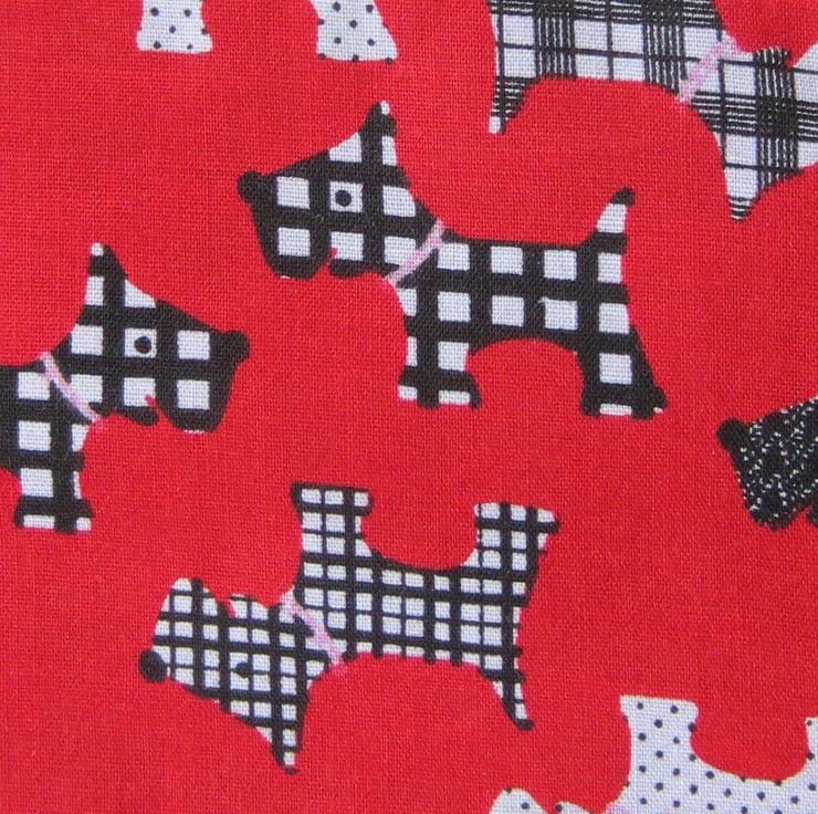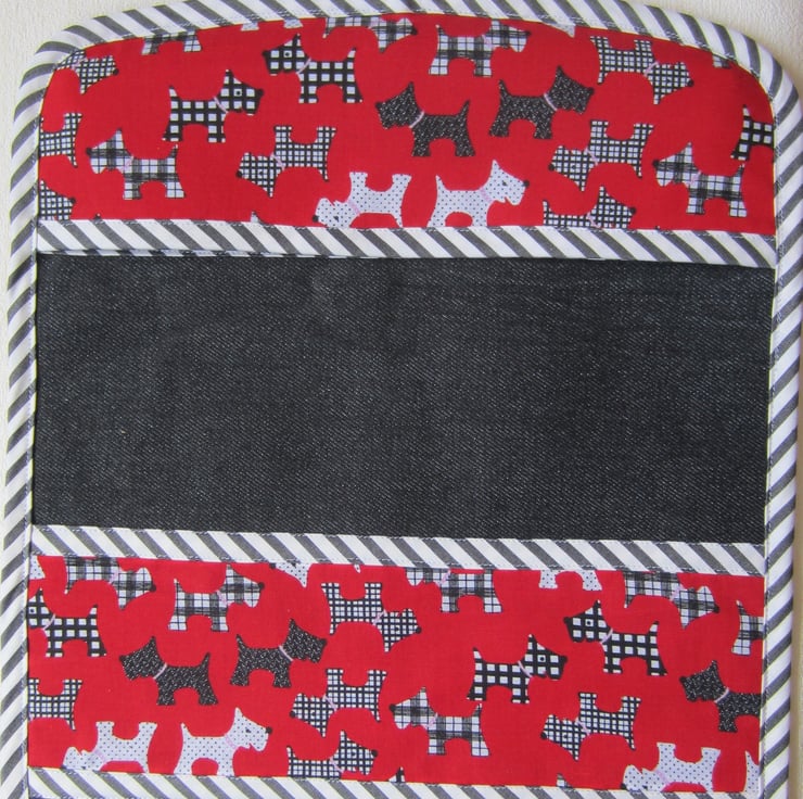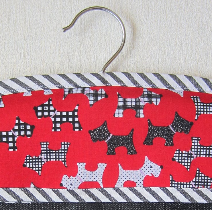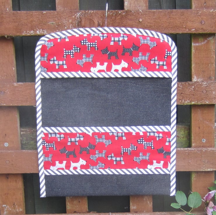Sturdy peg bag, unlined but made from strong black denim and red scottie dog panels. Edged with grey and white striped bias binding. Plenty of room for lots of pegs or use for other storage such as tights, socks, lingerie etc. It measures 30 x 35.5 cm and hangs with a strong wooden coat hanger.