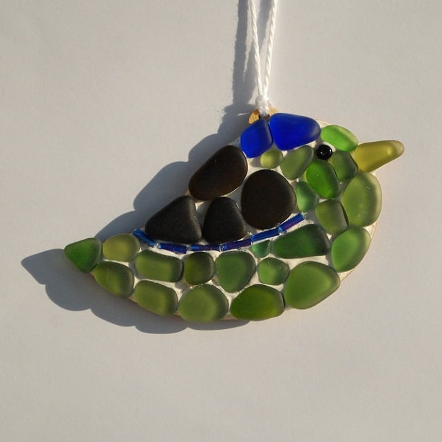 This lovely little bird hanger has been made from various colours of beach glass and glass beads. We have tumbled the glass so it is smooth and finely frosted. The glass has come from old bottles so the pieces are slightly curved, which adds to the three dimensional effect of the piece. The back of the wall hanger is top quality laser cut plywood which has an attractive brown edge.