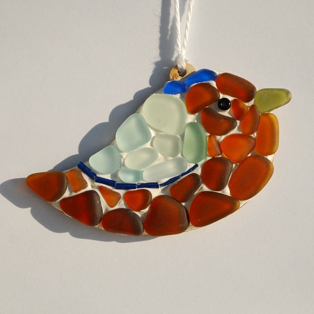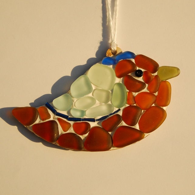 This lovely little bird hanger has been made from various colours of beach glass and glass beads. We have tumbled the glass so it is smooth and finely frosted. The glass has come from old bottles so the pieces are slightly curved, which adds to the three dimensional effect of the piece. The back of the wall hanger is top quality laser cut plywood which has an attractive brown edge.