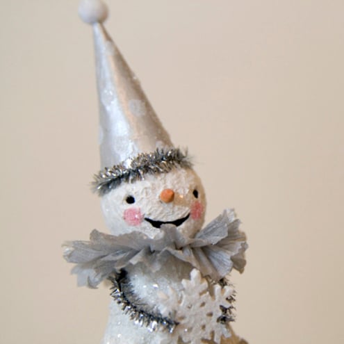Here we have a cute little vintage style snowman clown. He is on a vintage clip so you can put him on your tree. Made by hand from my own design each is one of a kind. Made from spun cotton, texture medium, glitter and crepe paper he measures approx 11cm. This is for the non smiling one.