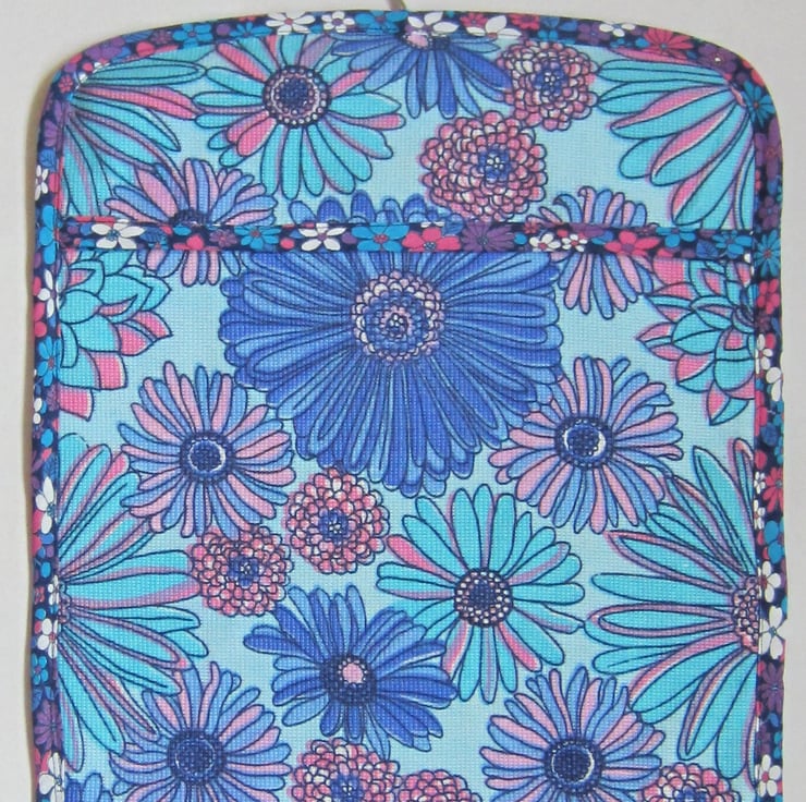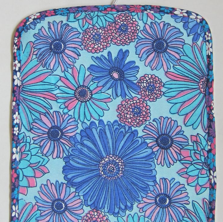 Lovely bright blue floral retro peg bag made from unused 1970s fabric. Fully lined with a coordinating blue and cream striped fabric. Plenty of room for lots of pegs or use for other storage such as lingerie. tights, socks etc. It measures 35.5 x 30 cm. Hangs with a strong wooden coat hanger.
