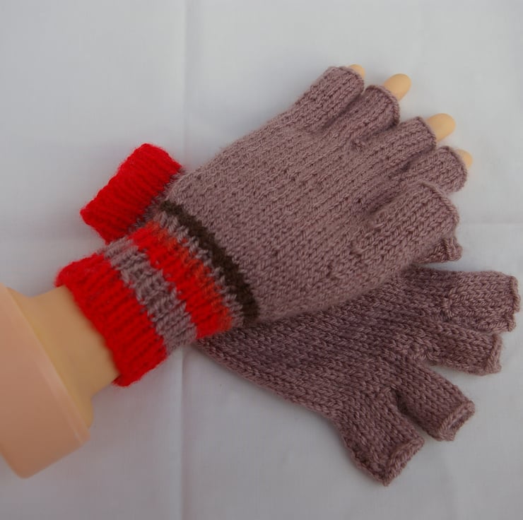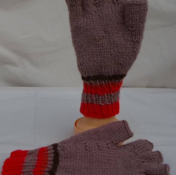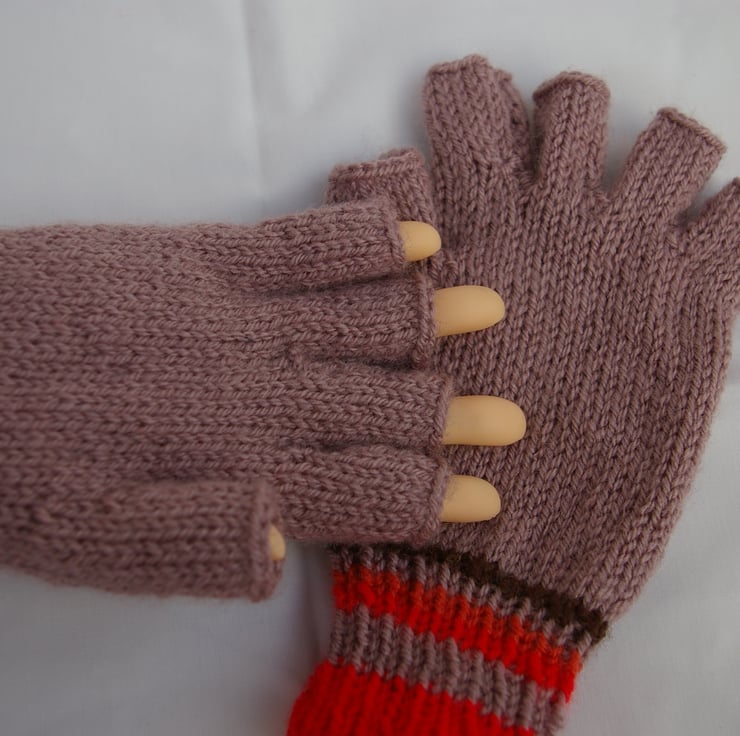 A pair of adult half finger gloves hand knitted in soft warm acrylic yarn. The gloves have a lovely bright striped cuff consisting of Autumn colours of red, orange, fawn and dark brown. The hand and fingers have been knitted in fawn. The main body of the glove has been knitted in the round so there is no sewing up seam.