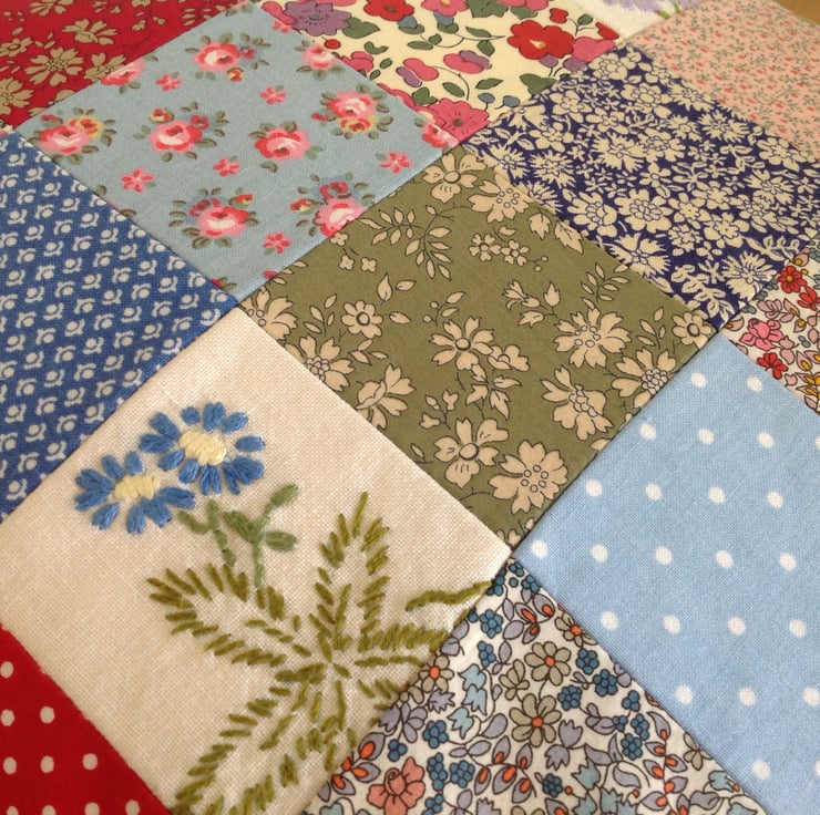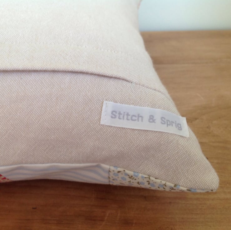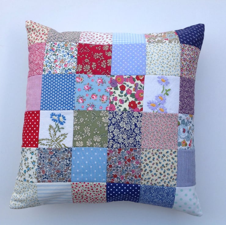 A handmade patchwork cushion made with a selection of my favourite Liberty, Cath Kidston and Laura Ashley fabrics. I've also used vintage embroidered linens as part of the design. Each cushion is filled with a duck feather pad and has a concealed YKK zip. All seams are overlocked for a professional finish. cushion pad measurements are approx 14 x 14 inches with cover to fit.