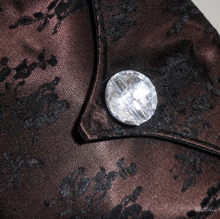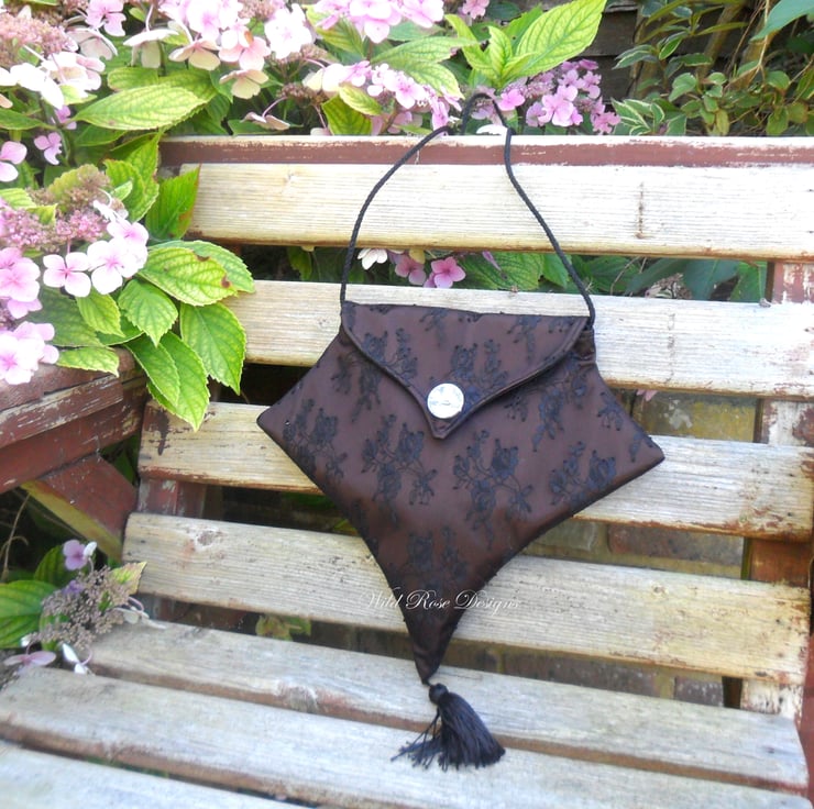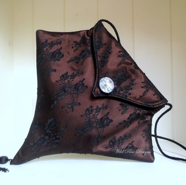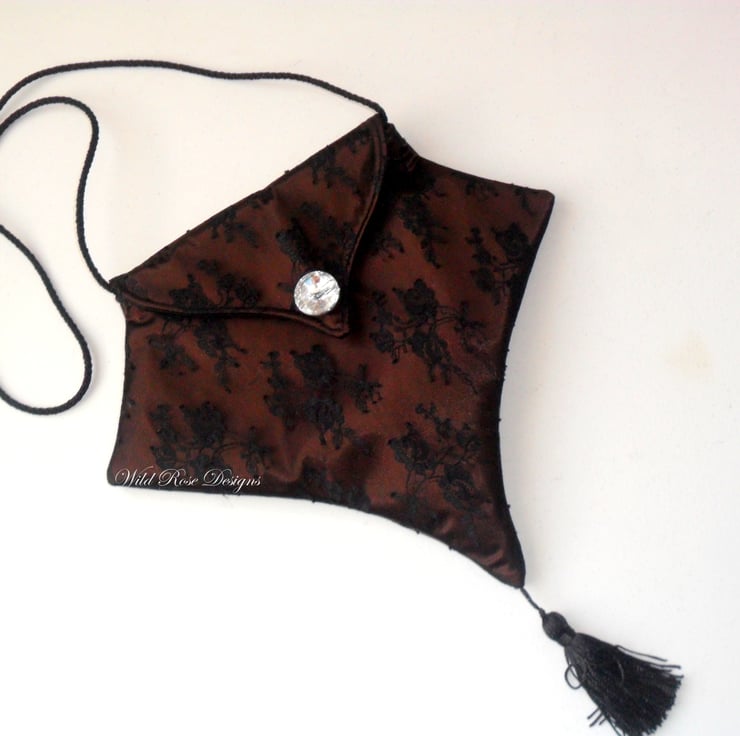 A lovely and unusual gothic inspired evening bag handmade in brown satin with a black lace overlay. The bag has an elongated point - echoed in the shape of the flap - with a black tassel. It has a 36" (90 cm ) black cord handle, long enough to slip over your shoulder. There is a magnetic snap fastening on the flap and a faceted acrylic button. Lined in black satin, there is also a small pocket.