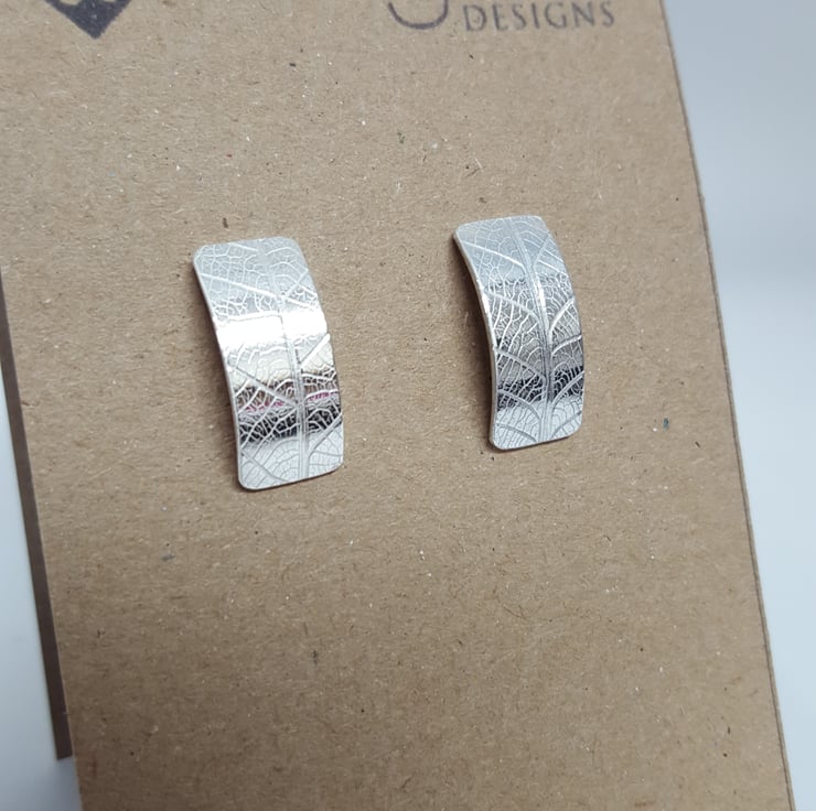 These stunning silver earrings sport a delicate leaf pattern imprinted into the silver, and are gently curved to create a beautiful designer piece of jewellery.