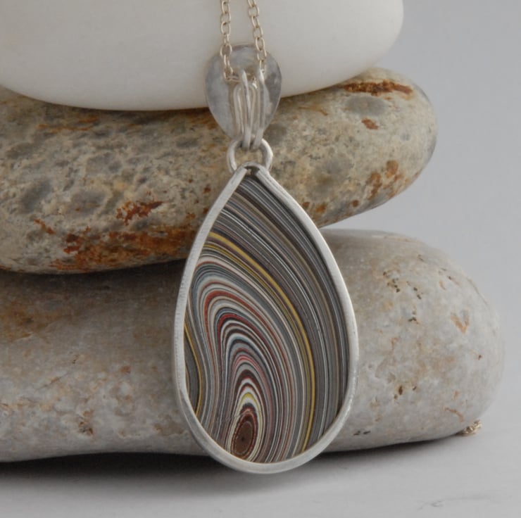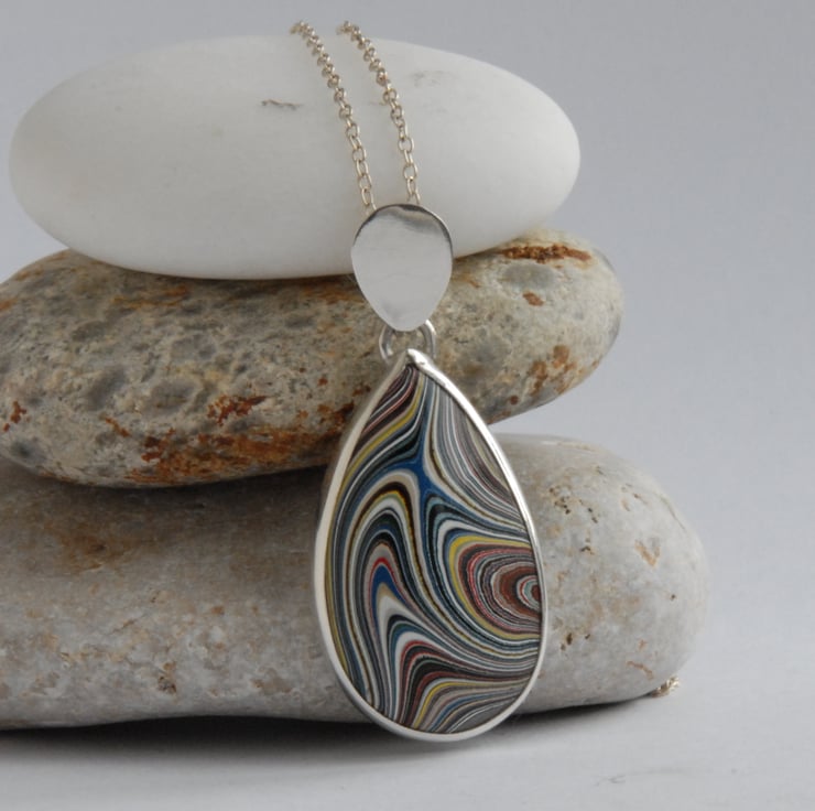 This sterling silver pendant features a pear shaped piece of fordite with a swirly pattern in blue, yellow, white, red and black, suitably psychadelic for this vintage material. I have left the back of the setting open so that you can appreciate the stripy pattern on the reverse (the bail could be flipped over and the piece worn backwards but the dome on the front means that it wouldn't sit well if worn backwards) and marvel at the sparkly layers of paint. Fordite is layers of cured car paint that built up in the spray booths before health and safety introduced air extraction systems, the fordite I use is vintage material that has come from the Dagenham Ford plant so is ideal for anyone who loves/ loved their cortina or capri back in the 70's.