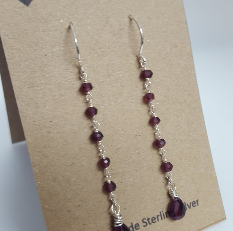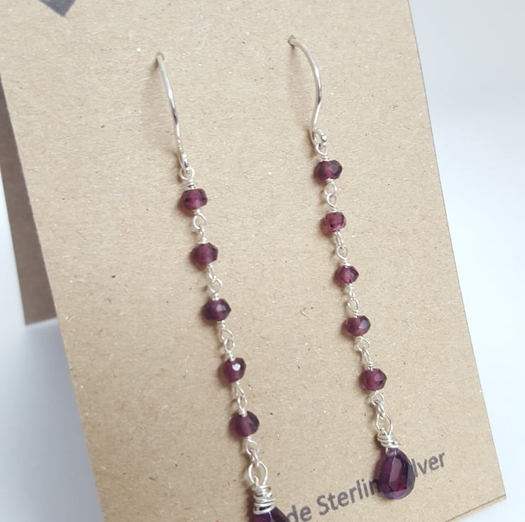 These drop earrings are formed from tiny round garnet beads, joined with slender silver wire, and are finished with a pear shaped garnet facetted briolette drop.