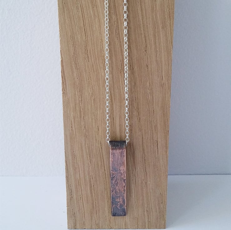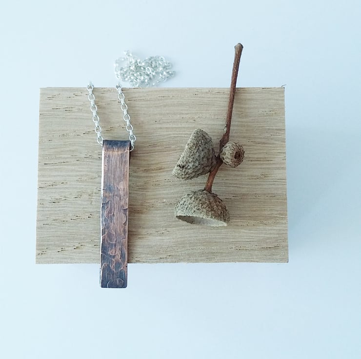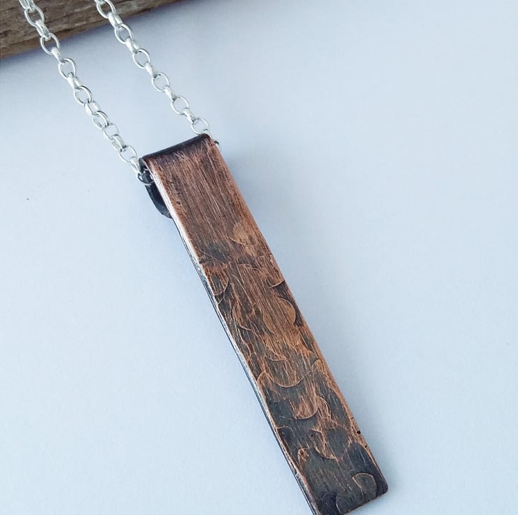 The pendant has been hammered to create an abstract floral pattern. I've oxidised it for a rustic look and to enhance the beauty of the metal.