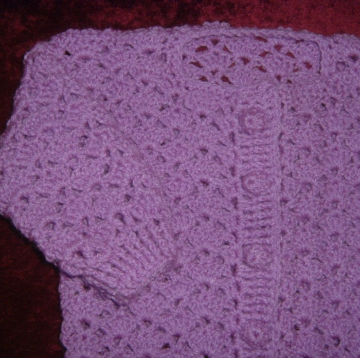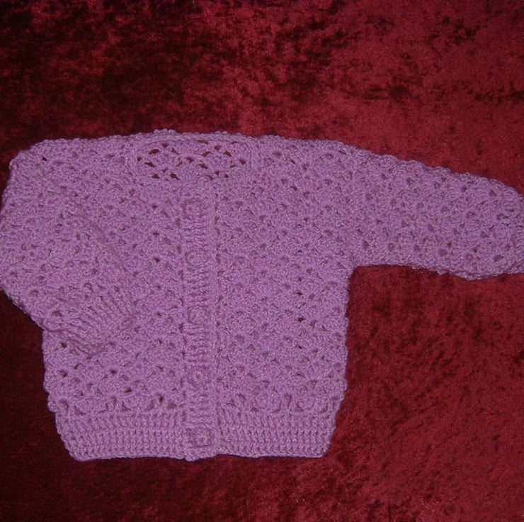a pretty hand crocheted lacy cardigan in 100% mauve acrylic yarn.
