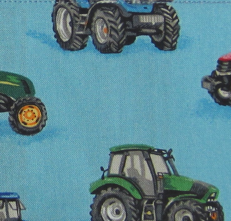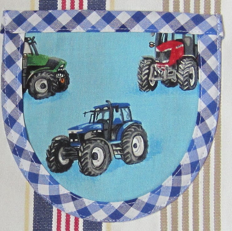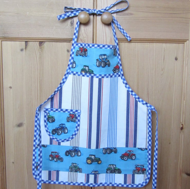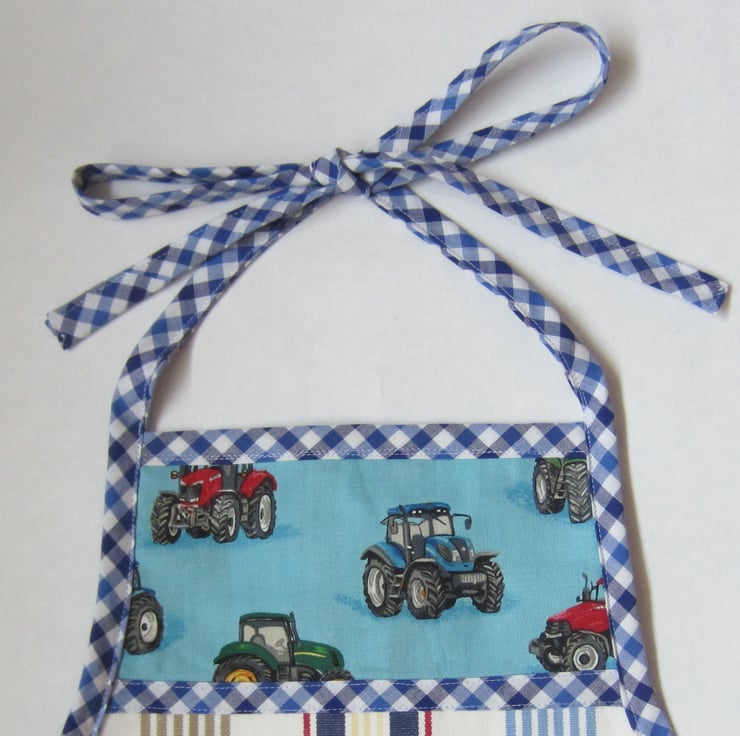 Striped apron with tractor panels and pocket, edged with blue check gingham. Suitable for a little boy or girl aged about 2 to 4 years old. It measures 46.5 cm long and 38.5 cm wide. Fastens with bows at waist and neck.