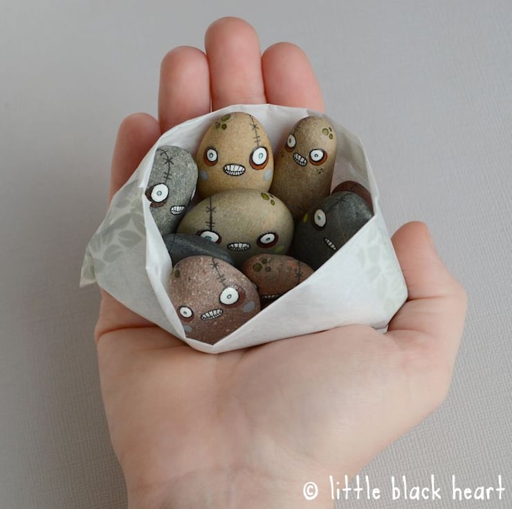each rock comes in his own little painted matchbox, complete with hand drawn portrait and quirky name on the front.