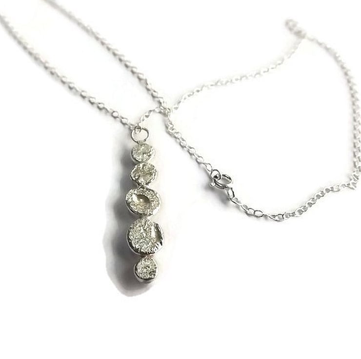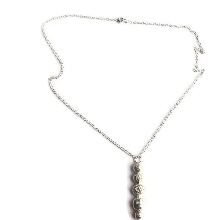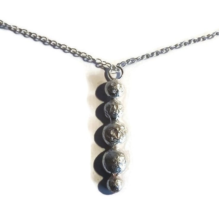 An usual, sleek pendant which has been made by turning little pieces of silver into "pebbles" by heating them into they roll up up into pebble like forms. These have then be soldered together in a row