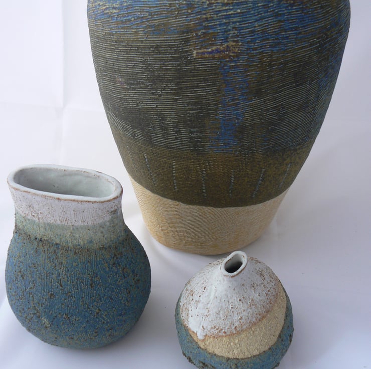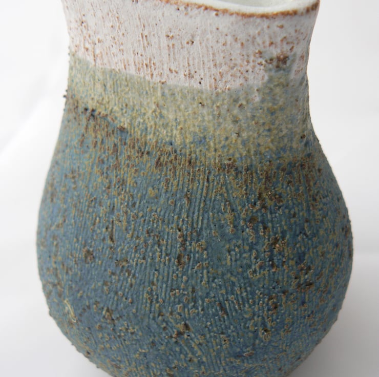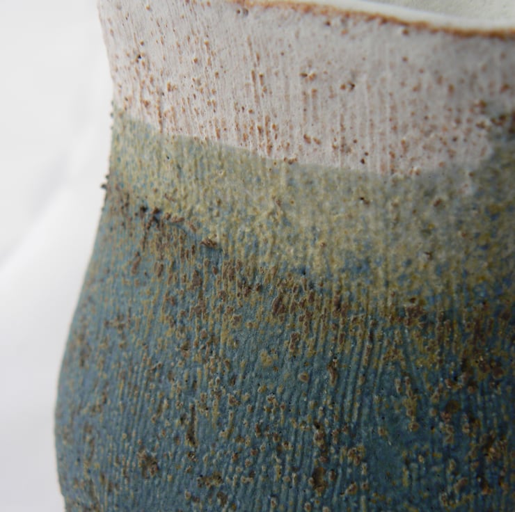A hand built ceramic clay vessel made from stoneware fired grogged clay. Finished with dry white and blue glazes with a slightly ochre colour where they have overlapped.