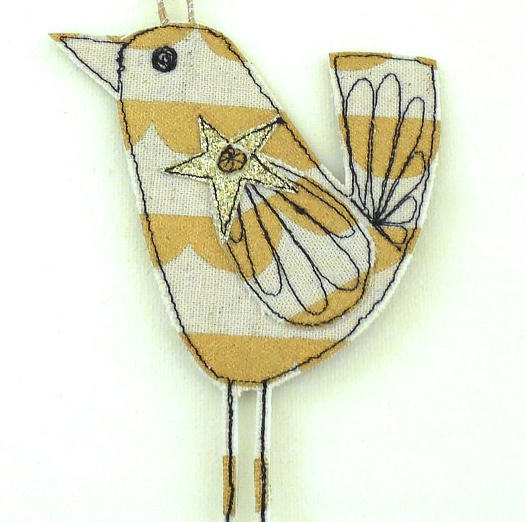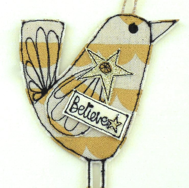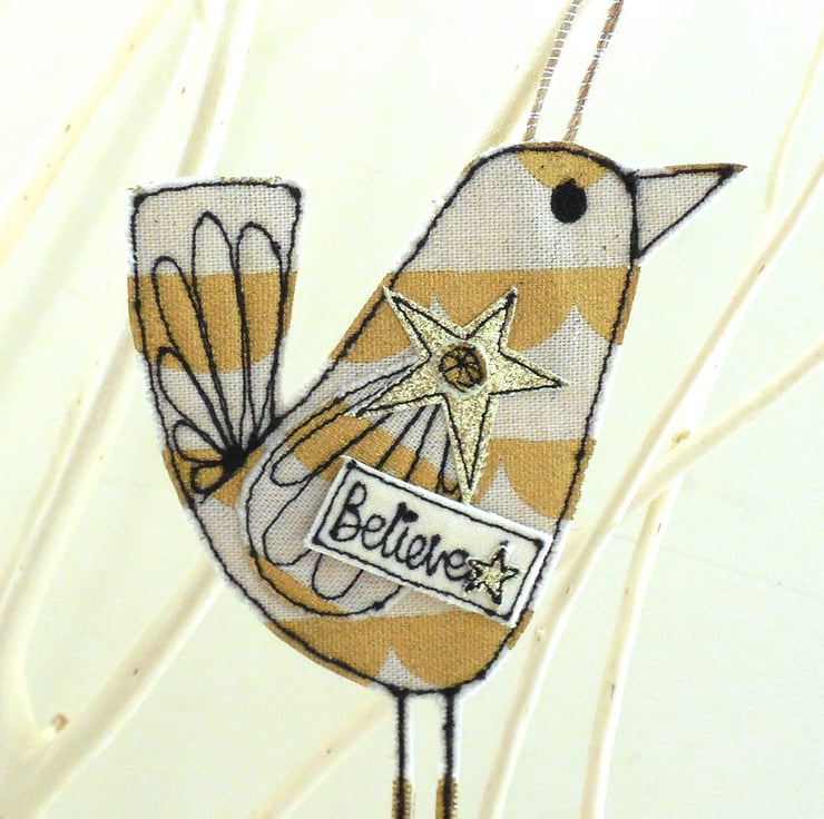 A fabric birdie measuring approximately 11cm with a thin cord to hang, in beige and gold cotton with a label saying 'Believe'.