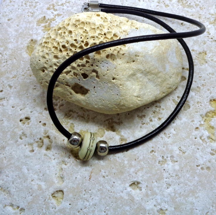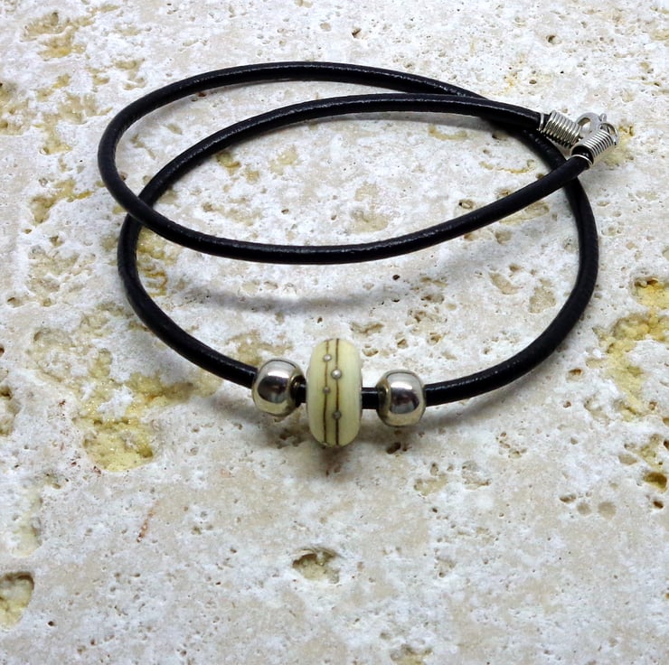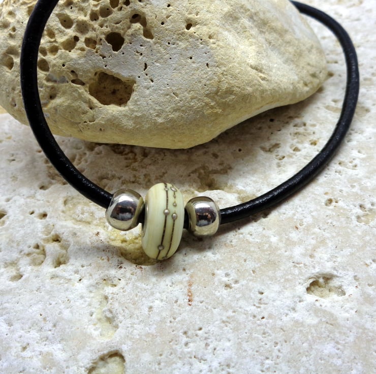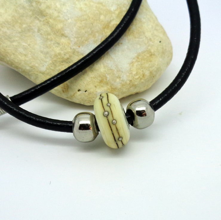 The focal bead is handmade torched glass & was sourced from a talented UK glass artist. Ivory coloured it has two central trails of fine silver dots, so it is truly unique. There is an "antiqued silver" metal bead either side & the core is 925 stamped sterling silver.