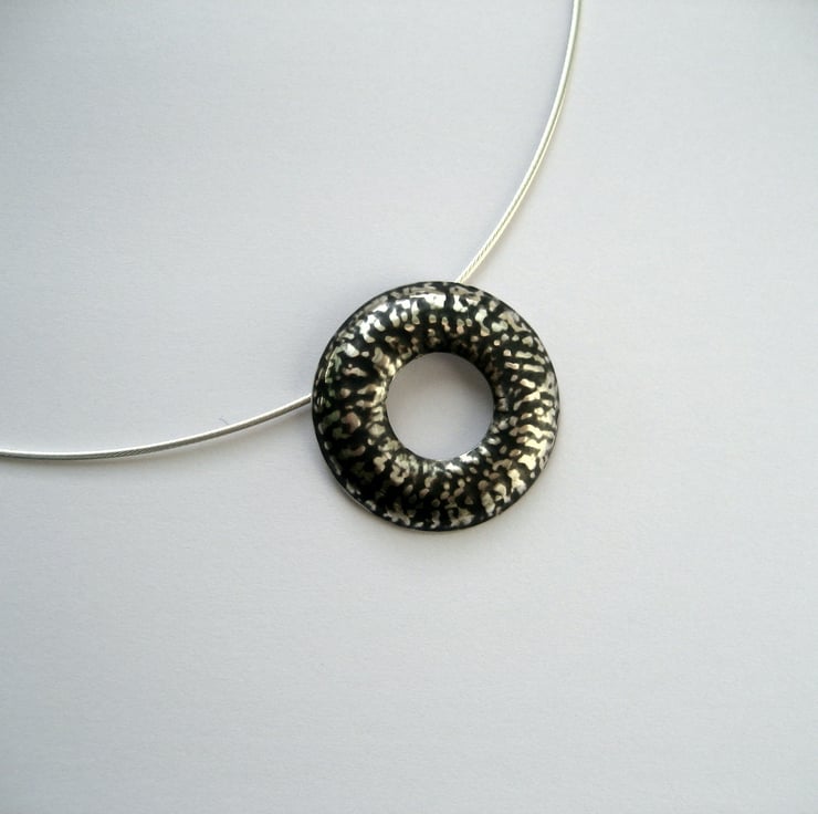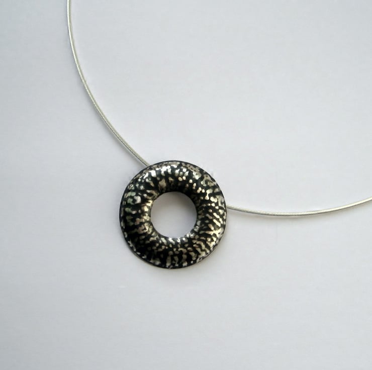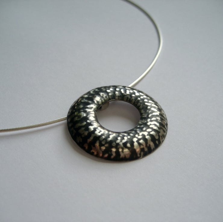 Handmade in my North Yorkshire studio, this Sterling Silver Pendant which is part Oxidised to create the two tone black and silver colour contrast is part of my Blackwave Range. The drop is a solid single circle of Silver with the centre cut out to form the doughnut shape which is then gently domed and textured using the technique of Repousse. The drop has a concealed silver tube soldered on the back which a 16" Sterling Silver Flexible Cable Chain threaded through. This cable is very strong and it fastens with a secure bayonet style fitting.