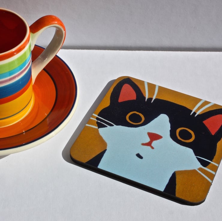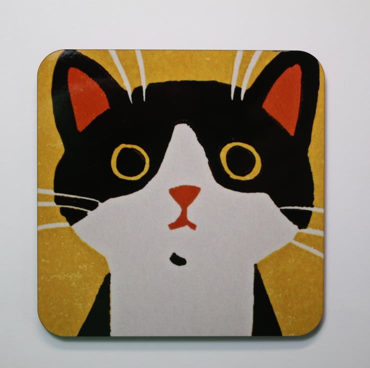 The striking, colourful design on these quality coasters is a high resolution digital photograph of my cute little black and white cat linocut.