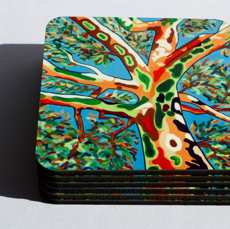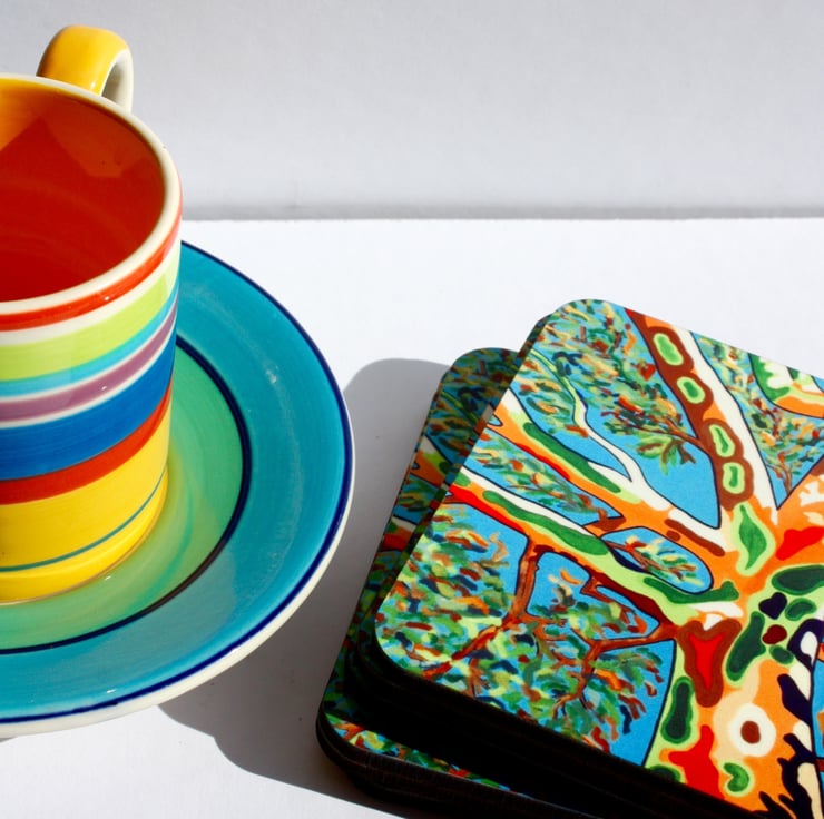 The striking, colourful design on these quality coasters is a high resolution digital photograph of a large acrylic painting that I made called 'Ellis Island Plane Tree : The Spirit of the Tree'. A great gift for anyone who loves nature, modern art or New York!