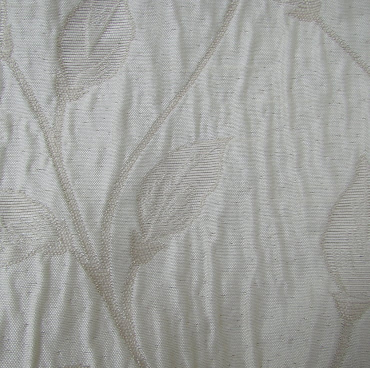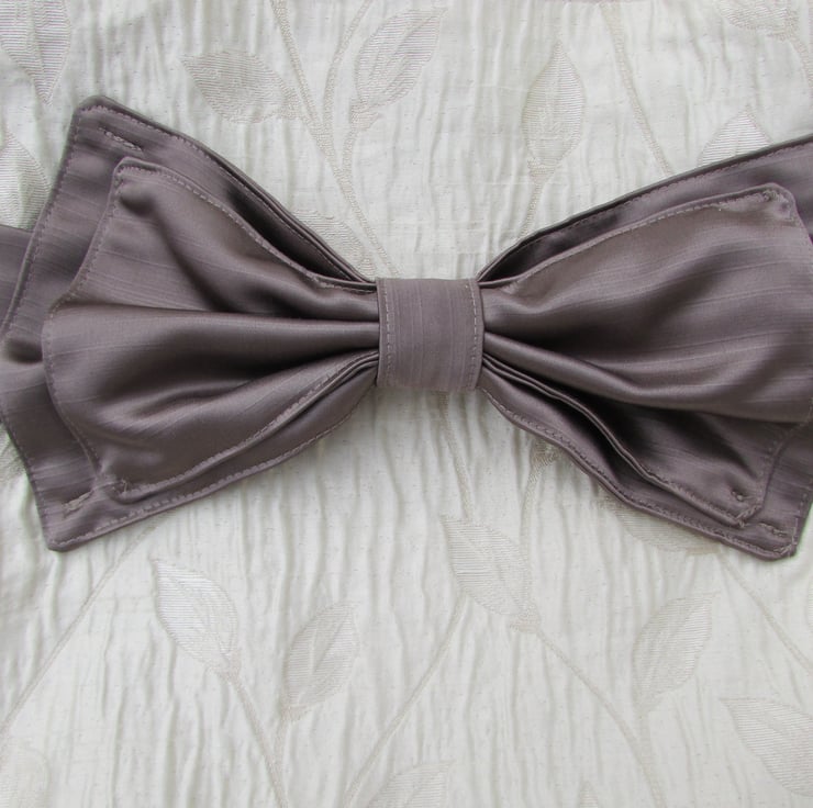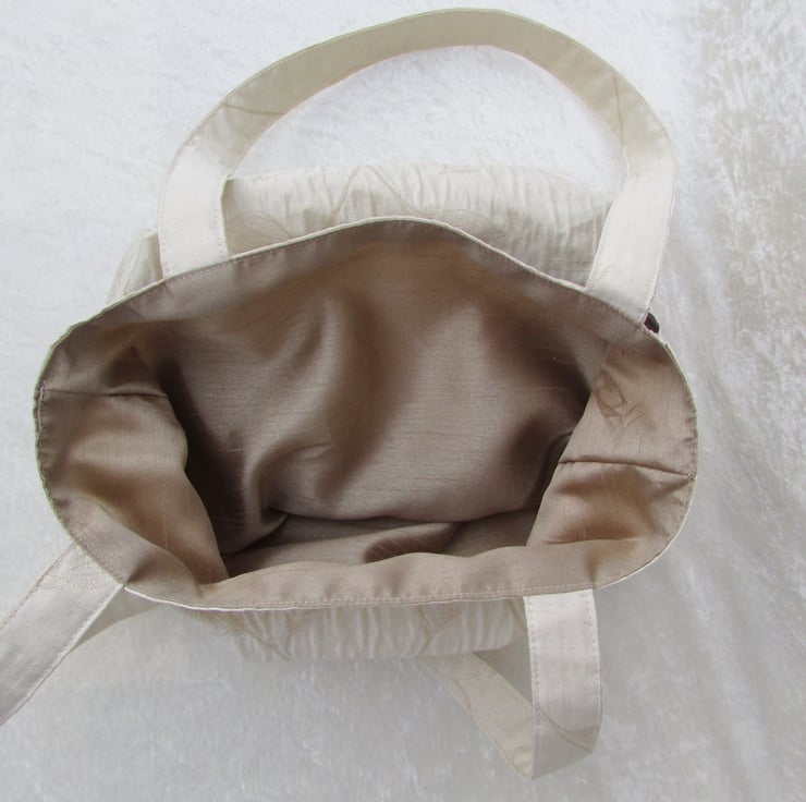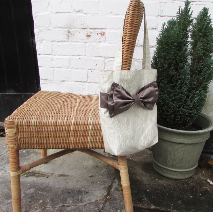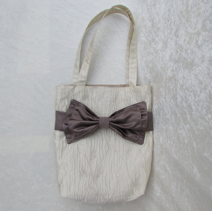This beautiful tote bag is made in a lovely cream satin finish fabric with a ripple surface and a woven leaf pattern. The front of the bag is embellished with a band and a beautiful large double bow in a contrasting brown satin fabric. The bag is fully lined with beige fabric.