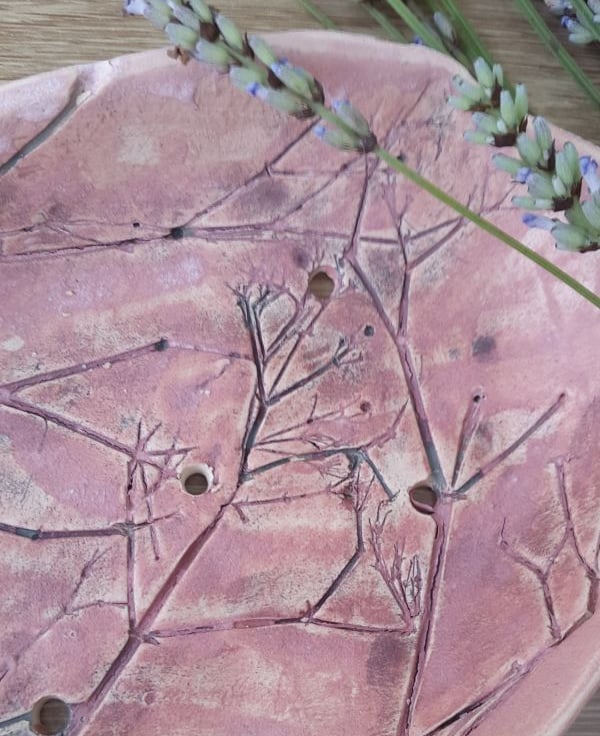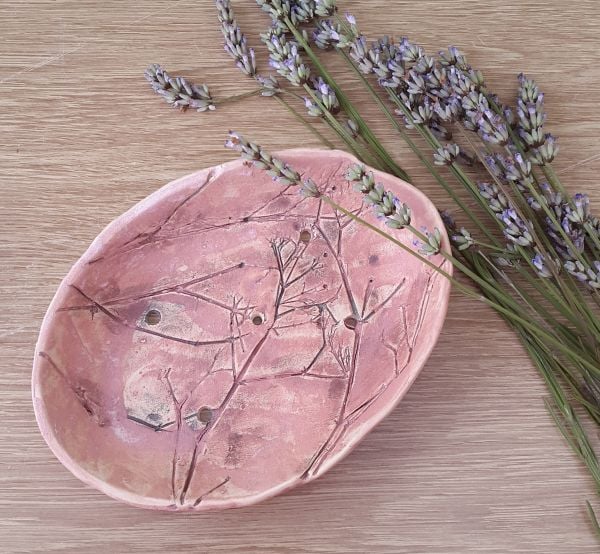 Gorgeous natural impressed flowers decorate the interior of the dish, with a pink matt glazed surface finish.