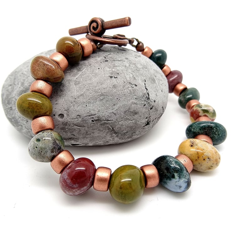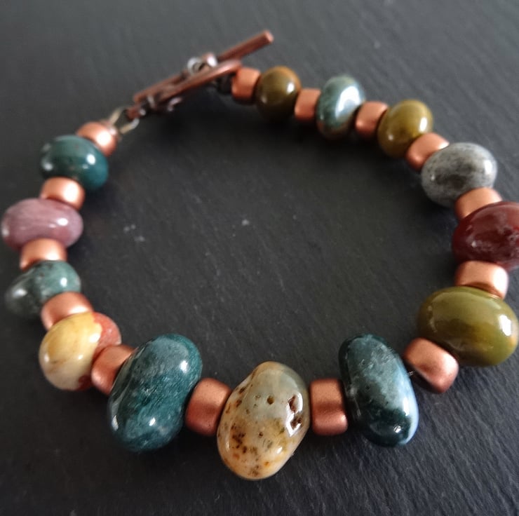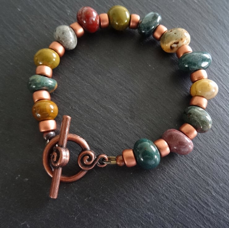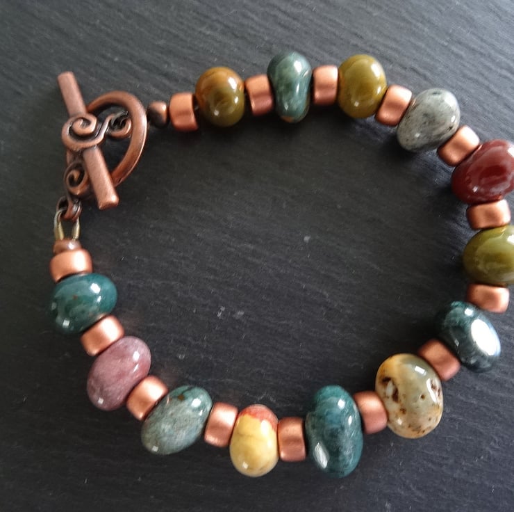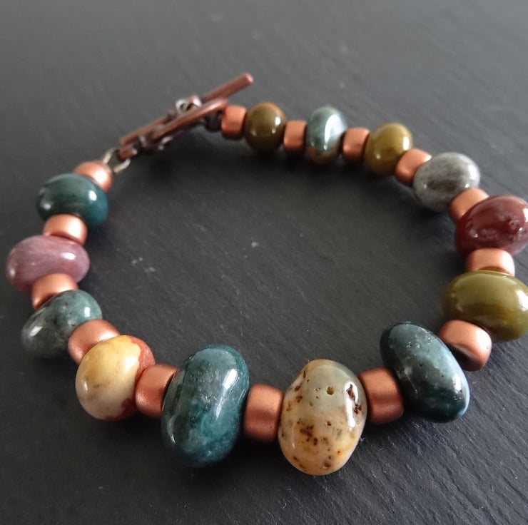 This is a lovely bracelet made with mixed jasper smooth nuggets which range in size from 10 to 15mm. These are interspersed with czech glass bronze coloured 5mm pony beads. The colours of the Jasper are green, mustard, grey, dark mauve and dark cream. The bracelet measures 20cm (8") and closes with a antique bronze coloured vintage style toggle clasp. As all of the items in my shop are unique, individual pieces made by myself, this is the bracelet you will receive. It will arrive gift wrapped in tissue paper and a organza bag.