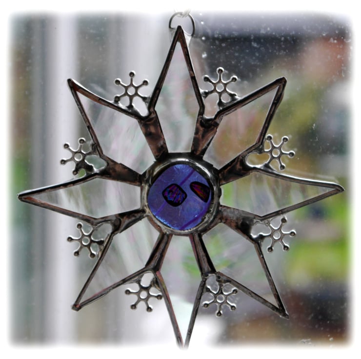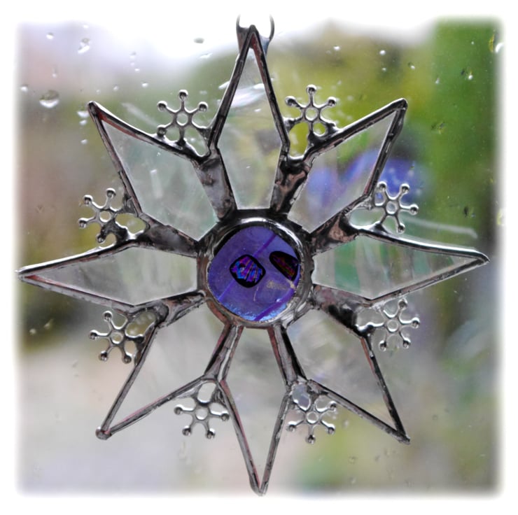 I've designed it with 8 diamond shaped points made from iridescent clear glass and at the centre a gorgeous twinkly lavender glass nugget with lovely dichroic accents which I made in my fusing kiln.