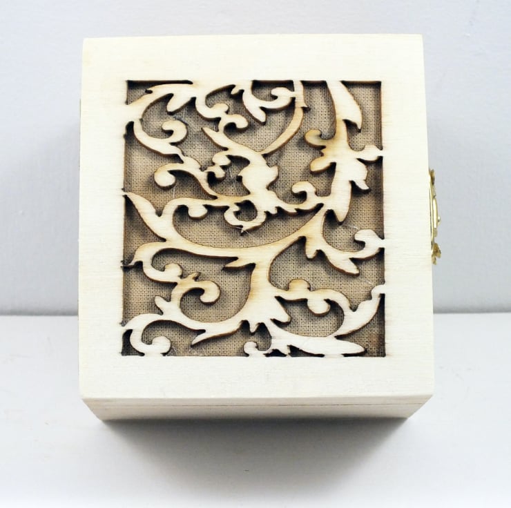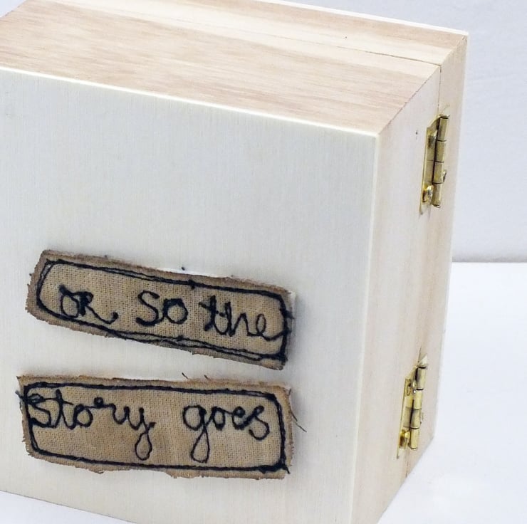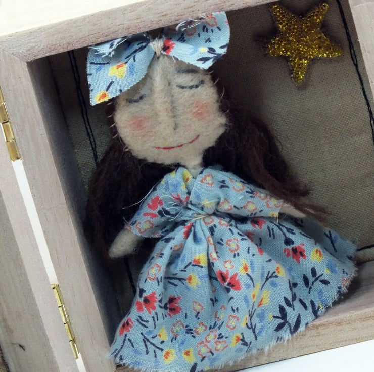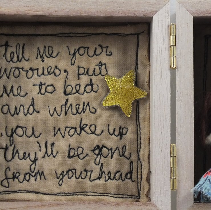 The box inners have been free machine embroidered on coffee dyed cotton. The doll is actually free standing an is not attached to the box.