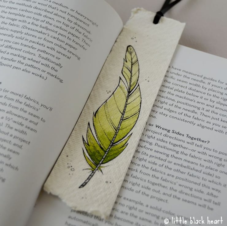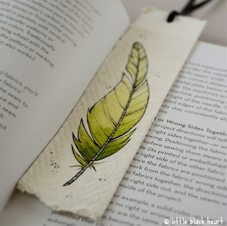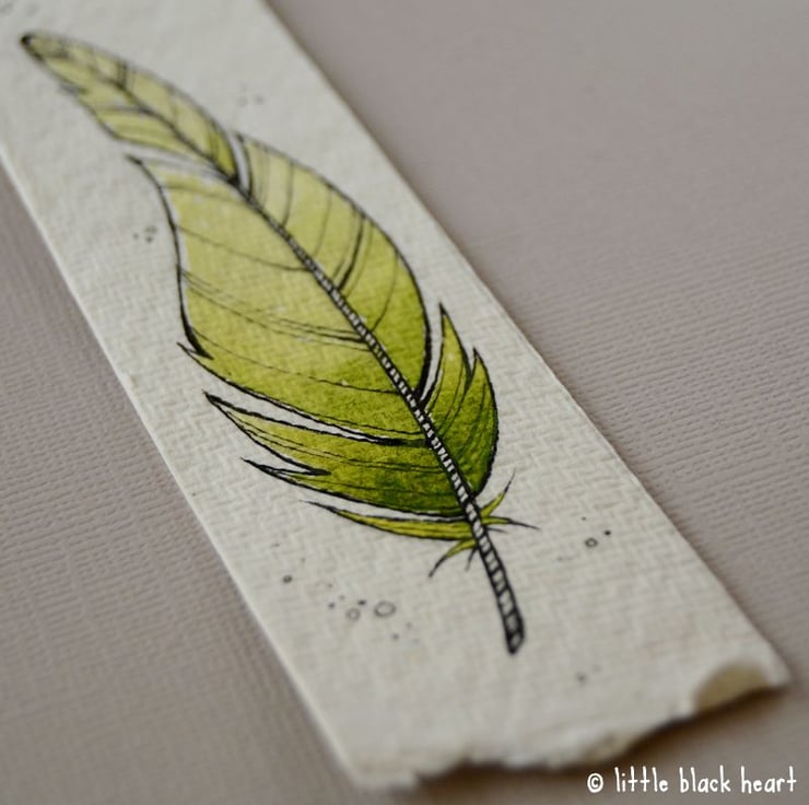 bookmark with original illustration - green feather