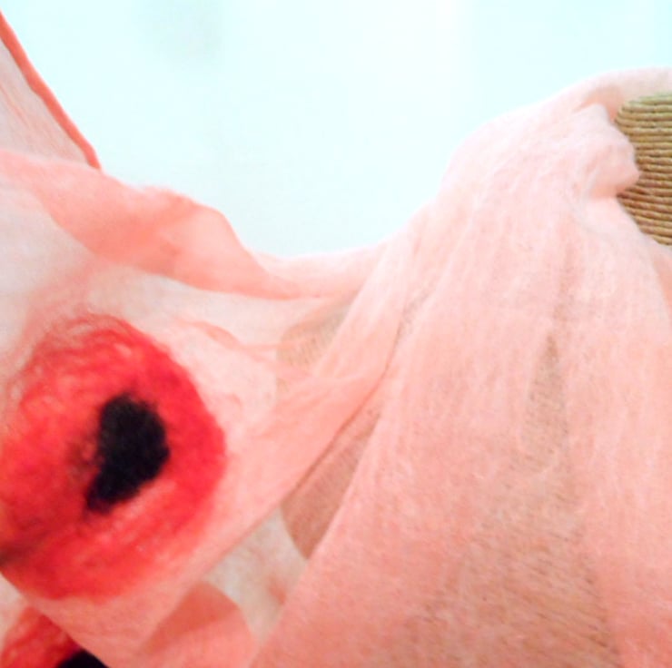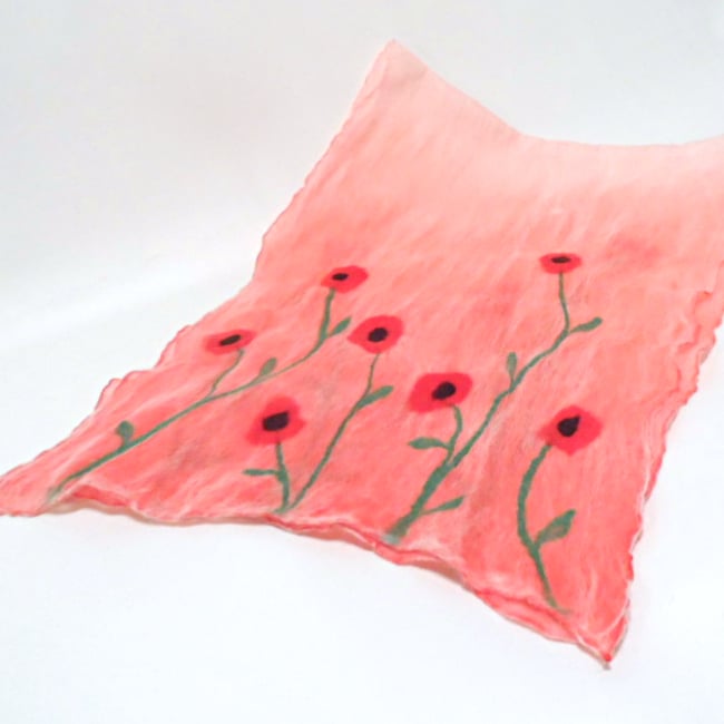 Nuno felting is a process which causes the wool fibres to migrate through the silk and bind with it. In this scarf the woollen fibre layers are extremely fine resulting in a very soft, sheer and lightweight scarf which drapes beautifully. It has been felted on both sides, the poppy decoration having been applied on one side only.