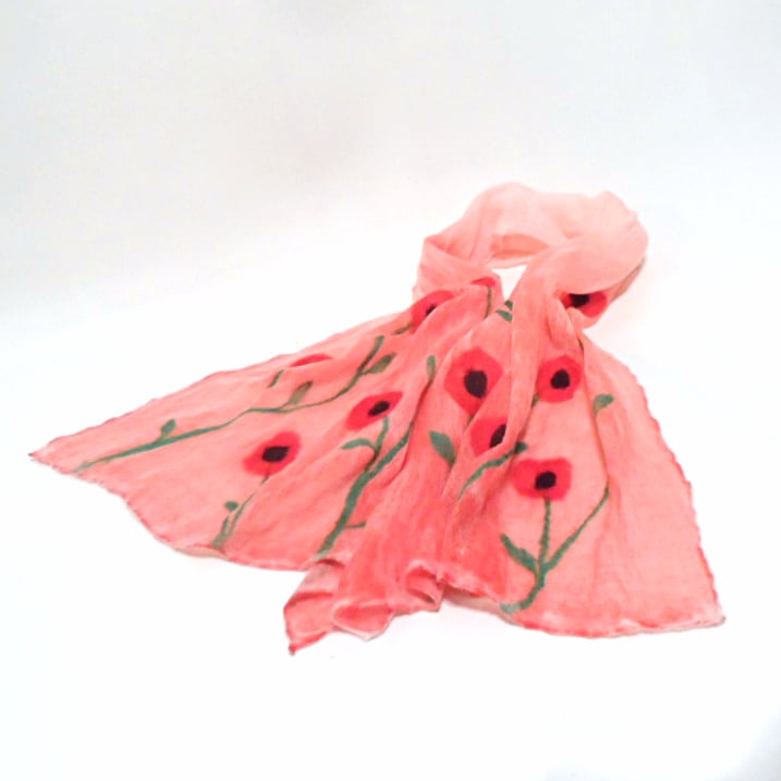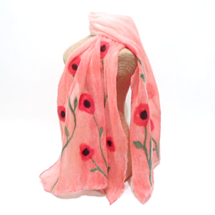 A nuno felted scarf made using white merino wool fibres on a red silk chiffon scarf base, resulting in an overall pink effect. The scarf has been decorated on one side with several large red poppies using red, black and green merino wool.