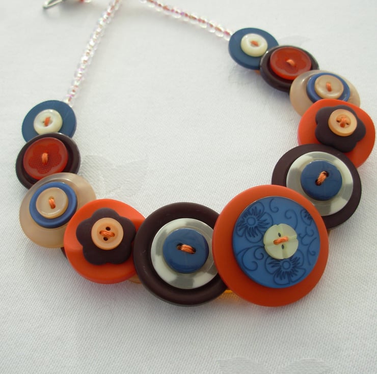 I've made this Shades of Africa layered and stacked handmade button necklace from assorted brown, cream, orange and blue coloured buttons threaded and knotted with 6 strands of embroidery thread and finished with little clear AB beads and a silve plated toggle clasp.